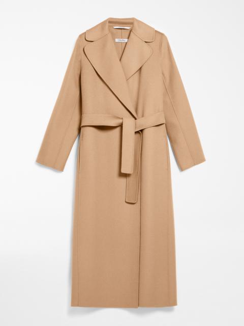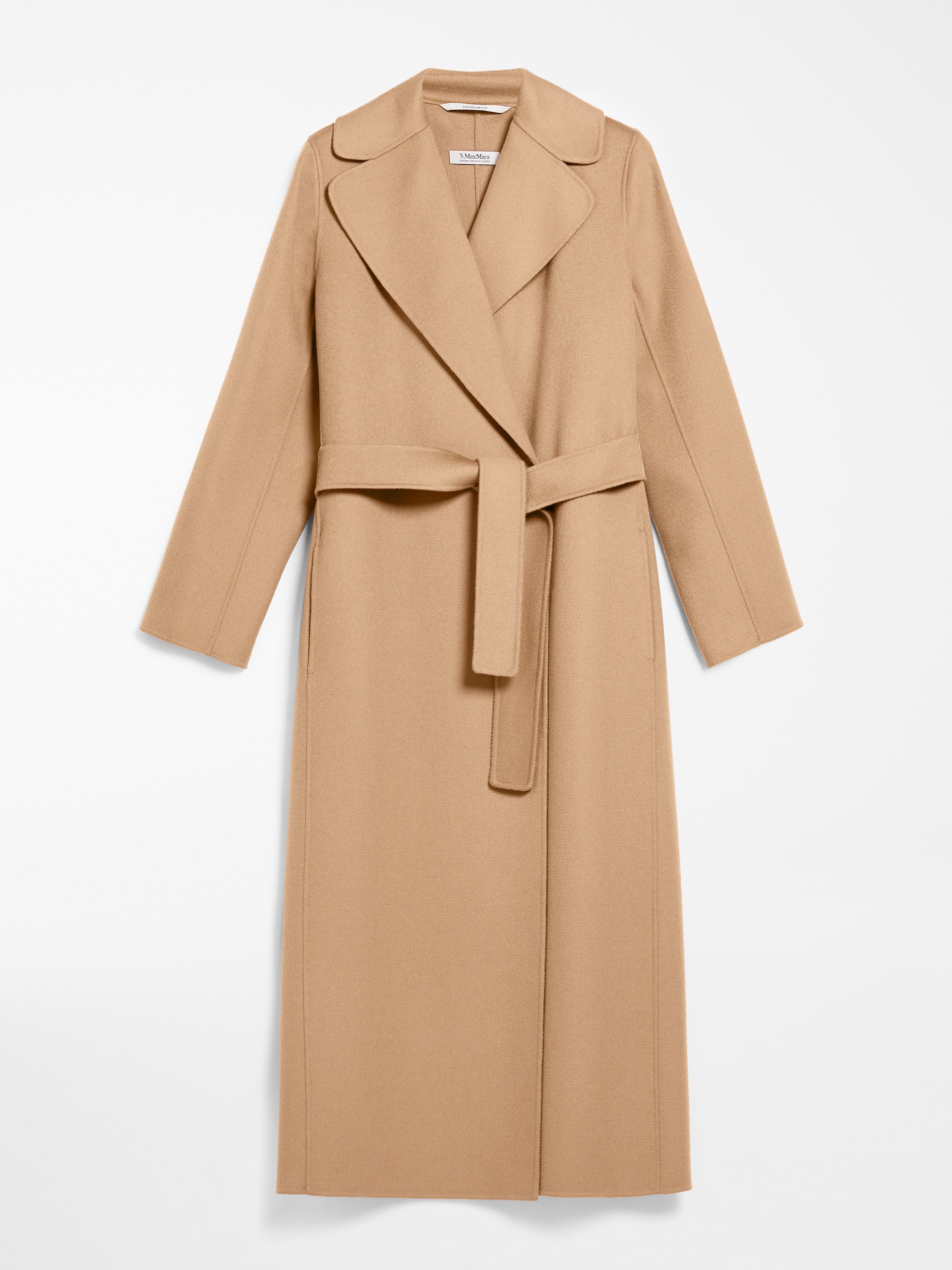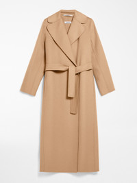 DETAILS Long wrap coat with enveloping lines made from exquisite pure double wool fabric. The unlined construction features a wide lapel collar, inset side pockets and set-in sleeves. The matching belt accentuates the feminine silhouette COMPOSITION AND CARE Fabric 100% virgin wool; - except joining thread; lining 100% silk. Do not wash; do not bleach; do not tumble dry; cool iron; professionally dry clean perchloroethylene - mild process; do not wet clean. Distributed by Max Mara S.r.l., registered office in Reggio Emilia (Italy), Via Giulia Maramotti 4, 42124 (IT)