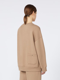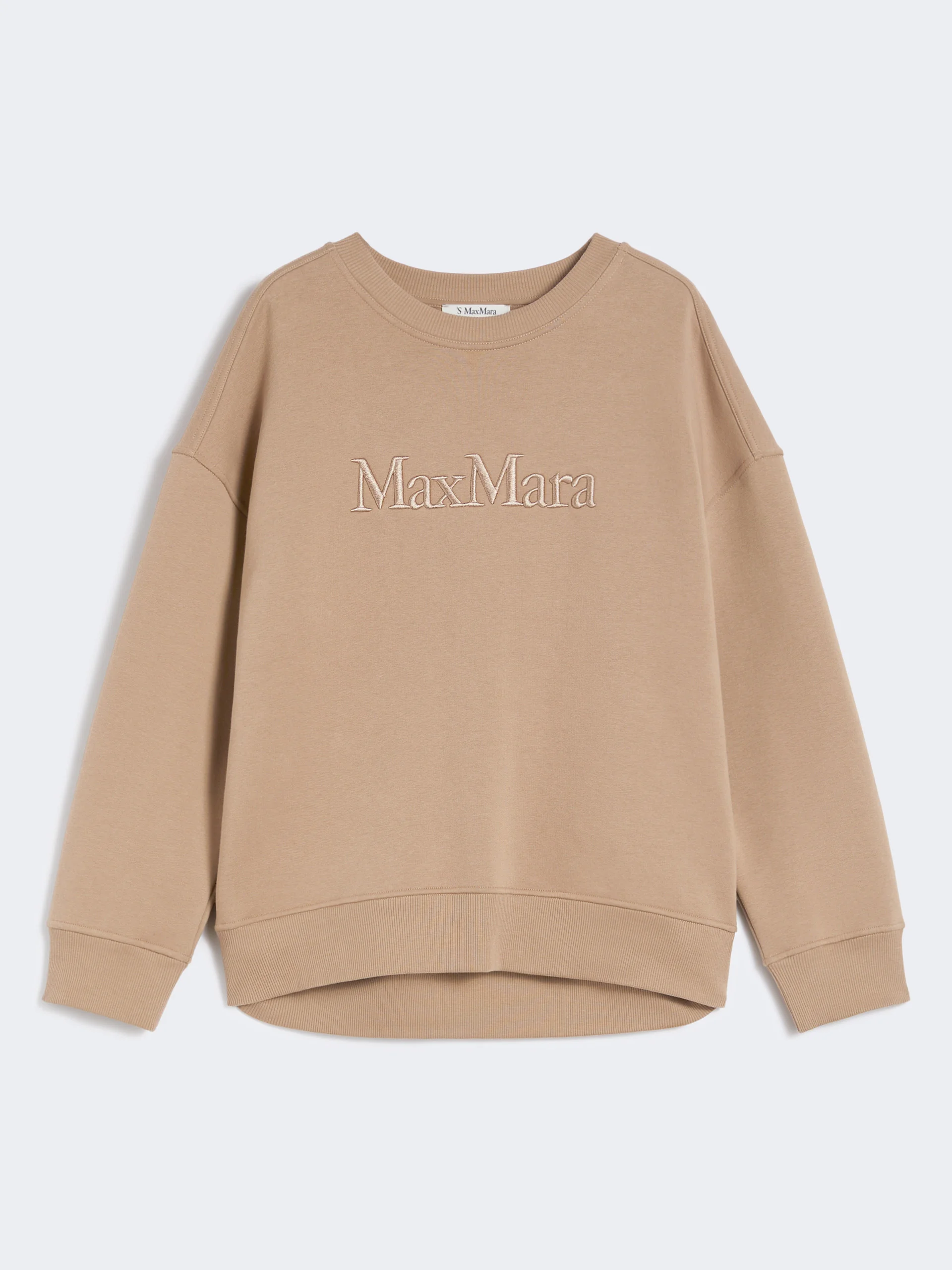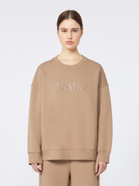DETAILS Relaxed-fit sweatshirt, customised with Max Mara logo embroidered on the centre front. Brushed cotton jersey sweatshirt Crew neck Long sleeves with dropped shoulders Right-hand pocket on the back hem with logo snap button Ribbed trim COMPOSITION AND CARE Jersey fabric 88% cotton, 8% polyamide, 4% elastane; - exclusive of embroideries. Machine wash cold delicate cycle; do not bleach; do not tumble dry; flat drying in the shade; cool iron; professionally dry clean perchloroethylene - mild process; professional wet cleaning - very mild process.; iron with a cloth between.; using neutral detergent.; turn the articles inside out before washing.; to be ironed on reverse. Distributed by Max Mara S.r.l., registered office in Reggio Emilia (Italy), Via Giulia Maramotti 4, 42124 (IT)