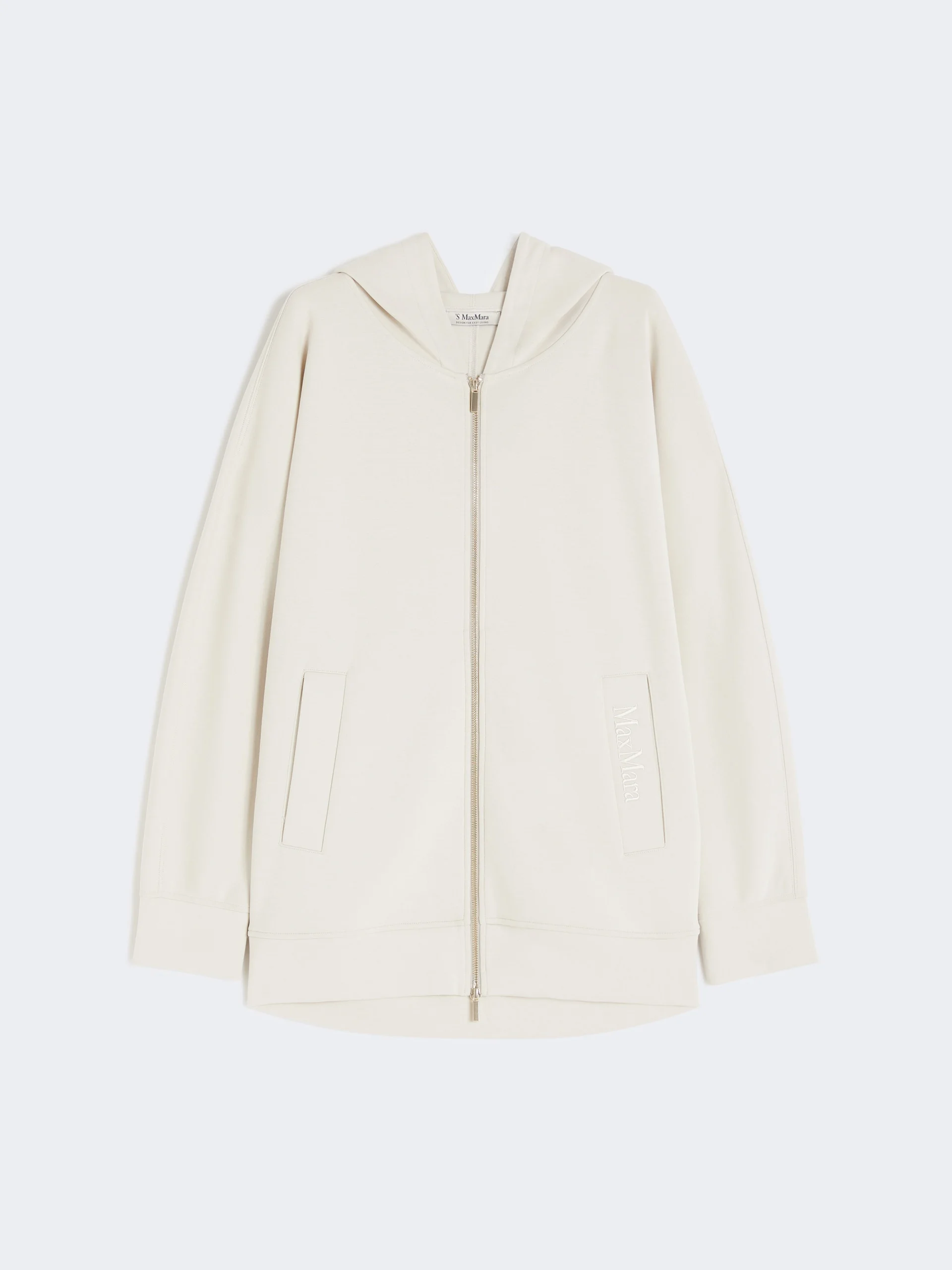 DETAILS Long, oversized sweatshirt with hood. Cotton jersey sweatshirt Long kimono sleeves Front zip closure Welt pockets on the sides Max Mara logo embroidered in-tone on the left-side pocket COMPOSITION AND CARE Jersey fabric 78% cotton, 22% polyester; - exclusive of embroideries. Machine wash cold delicate cycle; do not bleach; do not tumble dry; flat drying in the shade; cool iron; professionally dry clean perchloroethylene - mild process; professional wet cleaning - very mild process.; iron with a cloth between.; using neutral detergent.; turn the articles inside out before washing.; to be ironed on reverse. Distributed by Max Mara S.r.l., registered office in Reggio Emilia (Italy), Via Giulia Maramotti 4, 42124 (IT)