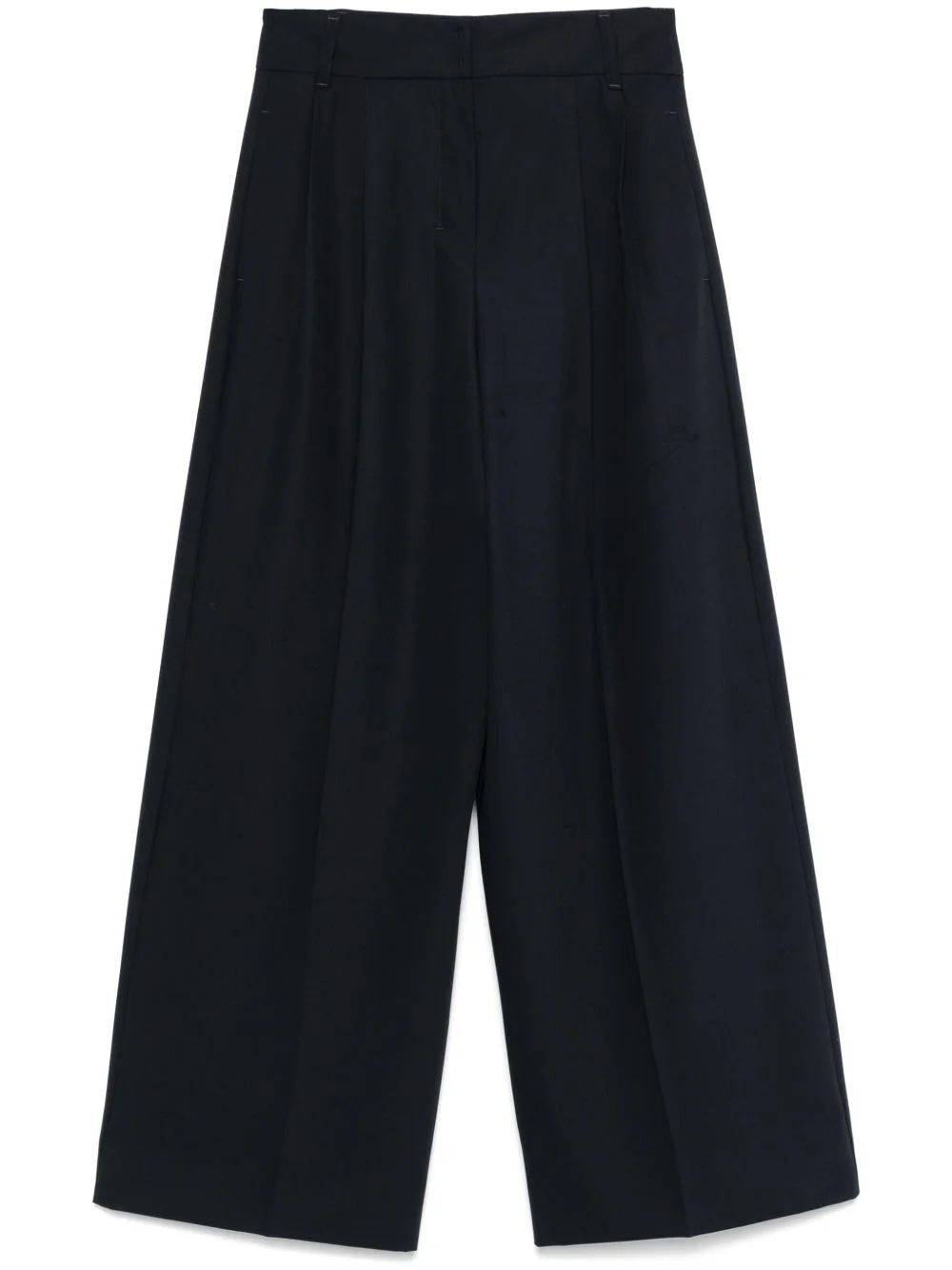 wide-leg trousers Highlights - Midnight blue - Concealed front button, hook and zip fastening - Two side inset pockets - Belt loops - Pleat detailing Imported Composition Virgin Wool 100% SIZE & FIT Model measurements Height 5 ft 11 in(1.8 m) Bust/Chest 31.49 in(80 cm) Hips 36.61 in(93 cm) Waist 24.4 in(62 cm) FittingInformation Designed with a wide-leg cut, these trousers allow for a close fit at the waist and offer a loose and roomy fit over the leg Made from a midweight non-stretch fabric, this piece offers minimal elasticity when worn