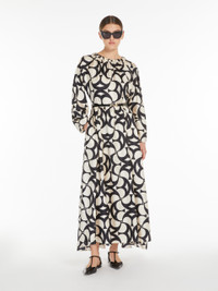 DETAILS Long, crew-neck dress made of exquisite pure-silk twill with all-over printed motif. The style features a feminine silhouette with a flared skirt and matching belt in gathered fabric and leather. Finished with a gathered collar, cuffs and waist, three-quarter length kimono-style puff sleeves, and inset side pockets. Concealed zip fastening on the back. COMPOSITION AND CARE 100% silk. Do not wash; do not bleach; do not tumble dry; cool iron; professionally dry clean perchloroethylene - mild process; do not wet clean.; remove the belt before washing.; contains non-textile parts of animal origin. Distributed by Max Mara S.r.l., registered office in Reggio Emilia (Italy), Via Giulia Maramotti 4, 42124 (IT)