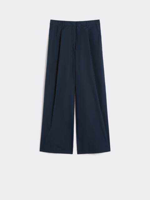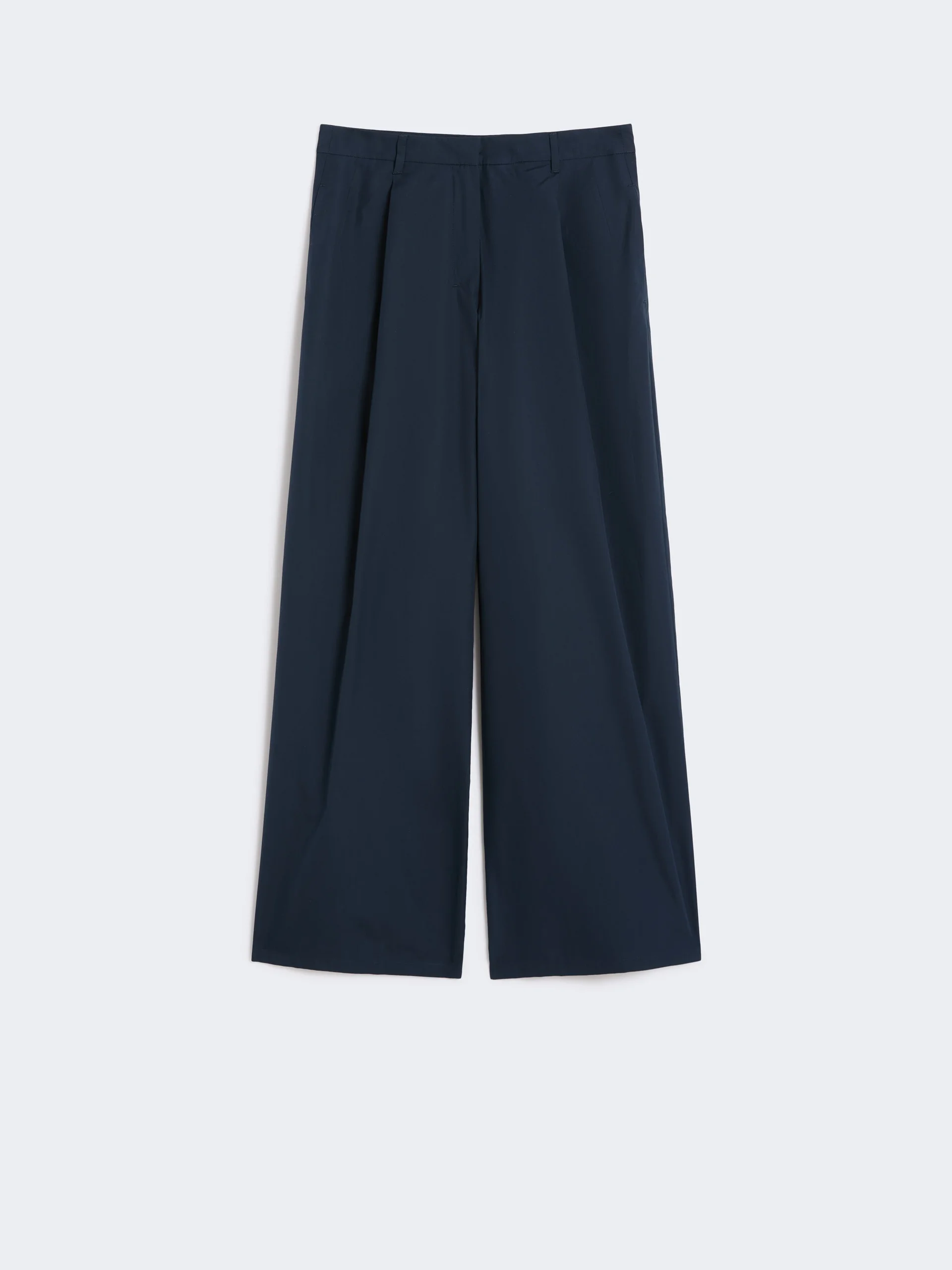 DETAILS Trousers featuring double front dart detail which contributes to the wide-leg cut. Washed pure cotton poplin trousers High-cut waistband with a fly-covered zip and hook-and-bar fastening In-seam side pockets Welt rear pockets Belt loops COMPOSITION AND CARE 100% cotton. Machine wash cold delicate cycle; do not bleach; do not tumble dry; line drying in the shade; cool iron; professionally dry clean perchloroethylene - mild process.; wash the garment while it is fastened.; do not iron the buttons.; protect buttons before washing.; contains non-textile parts of animal origin. Distributed by Max Mara S.r.l., registered office in Reggio Emilia (Italy), Via Giulia Maramotti 4, 42124 (IT)