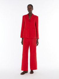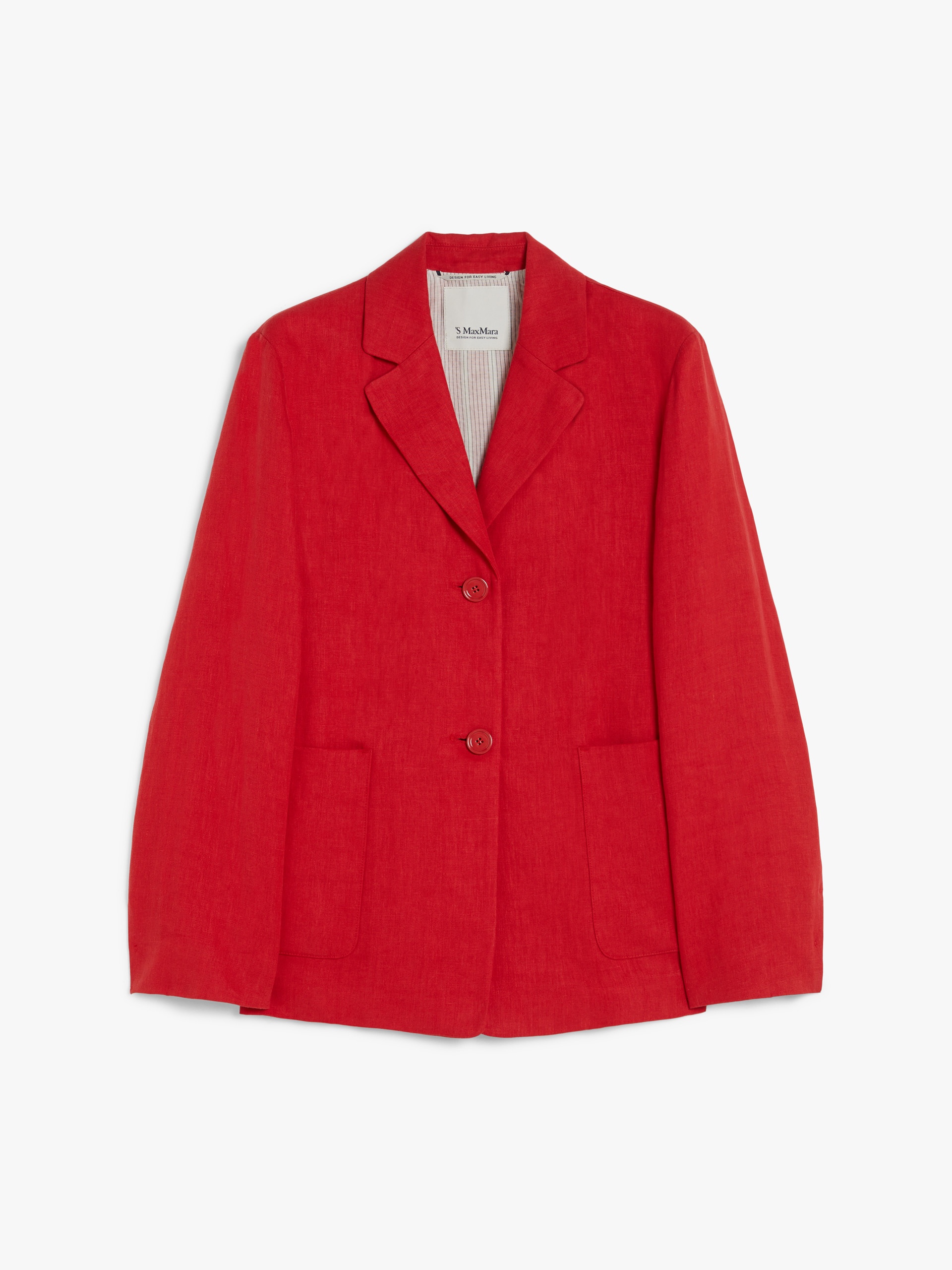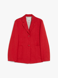 DETAILS Single-breasted jacket made of pure washed linen twill fabric. Semi-lined, straight-cut style featuring a lapel collar, long set-in sleeves and large patch pockets on the front. Features small slits at the cuffs and a front fastening with three visible buttons. COMPOSITION AND CARE Fabric 100% flaxlinen; upper lining 92% cotton, 8% polyamide; sleeves lining 100% cotton. Do not wash; do not bleach; do not tumble dry; cool iron; professionally dry clean perchloroethylene - mild process; do not wet clean.; wash the garment while it is fastened.; turn the articles inside out before washing. Distributed by Max Mara S.r.l., registered office in Reggio Emilia (Italy), Via Giulia Maramotti 4, 42124 (IT)