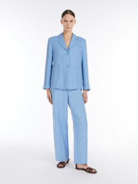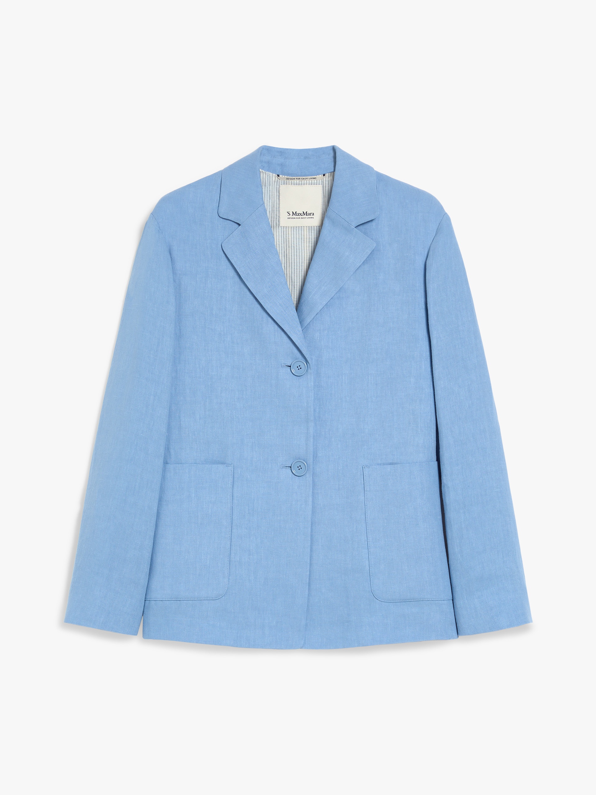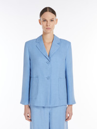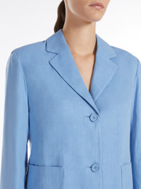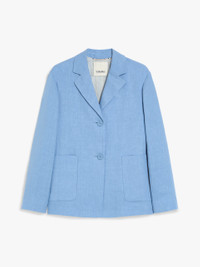 DETAILS Single-breasted jacket made of pure washed linen twill fabric. Semi-lined, straight-cut style featuring a lapel collar, long set-in sleeves and large patch pockets on the front. Features small slits at the cuffs and a front fastening with three visible buttons. COMPOSITION AND CARE Fabric 100% flaxlinen; upper lining 92% cotton, 8% polyamide; sleeves lining 100% cotton. Do not wash; do not bleach; do not tumble dry; cool iron; professionally dry clean perchloroethylene - mild process; do not wet clean.; wash the garment while it is fastened.; turn the articles inside out before washing. Distributed by Max Mara S.r.l., registered office in Reggio Emilia (Italy), Via Giulia Maramotti 4, 42124 (IT)