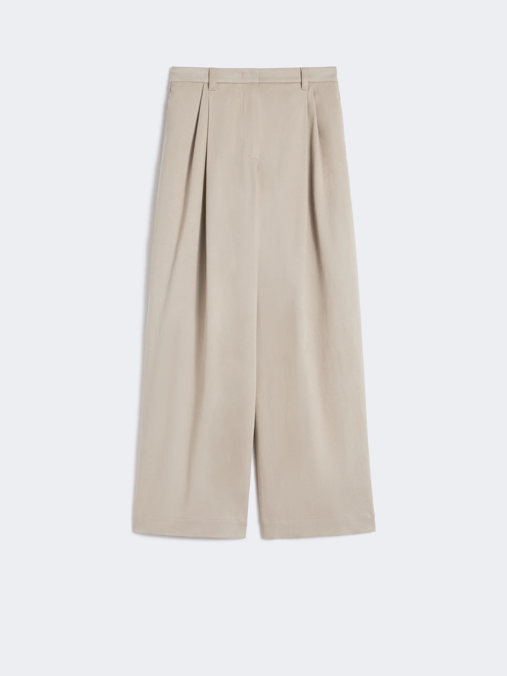 DETAILS Wide-leg trousers featuring double dart detail on the front. Trousers in washed stretch cotton drill fabric High-cut waistband with a fly-covered zip and hook-and-bar fastening Slant side pockets Welt rear pockets with horn button detail Belt loops COMPOSITION AND CARE 56% lyocell, 42% cotton, 2% elastane. Machine wash cold delicate cycle; do not bleach; do not tumble dry; line drying in the shade; cool iron; professionally dry clean perchloroethylene - mild process.; wash the garment while it is fastened.; do not iron the buttons.; protect buttons before washing.; turn the articles inside out before washing.; contains non-textile parts of animal origin. Distributed by Max Mara S.r.l., registered office in Reggio Emilia (Italy), Via Giulia Maramotti 4, 42124 (IT)