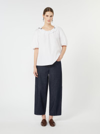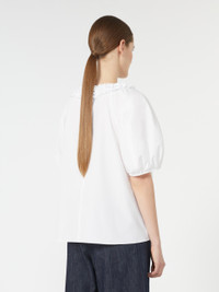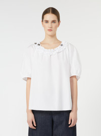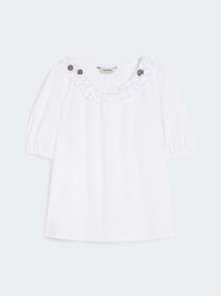 DETAILS Blouse with double row of ruffles around the neckline embellished with three removable jewel appliques. - Washed pure cotton poplin blouse - Slightly flared line - Crew neckline - Wide three-quarter puffed raglan sleeves - Gathered cuffs COMPOSITION AND CARE Fabric 100% cotton; - exclusive of decoration. Machine wash cold delicate cycle; do not bleach; do not tumble dry; line drying in the shade; cool iron; professionally dry clean perchloroethylene - mild process.; remove the decorations before washing. Distributed by Max Mara S.r.l., registered office in Reggio Emilia (Italy), Via Giulia Maramotti 4, 42124 (IT)