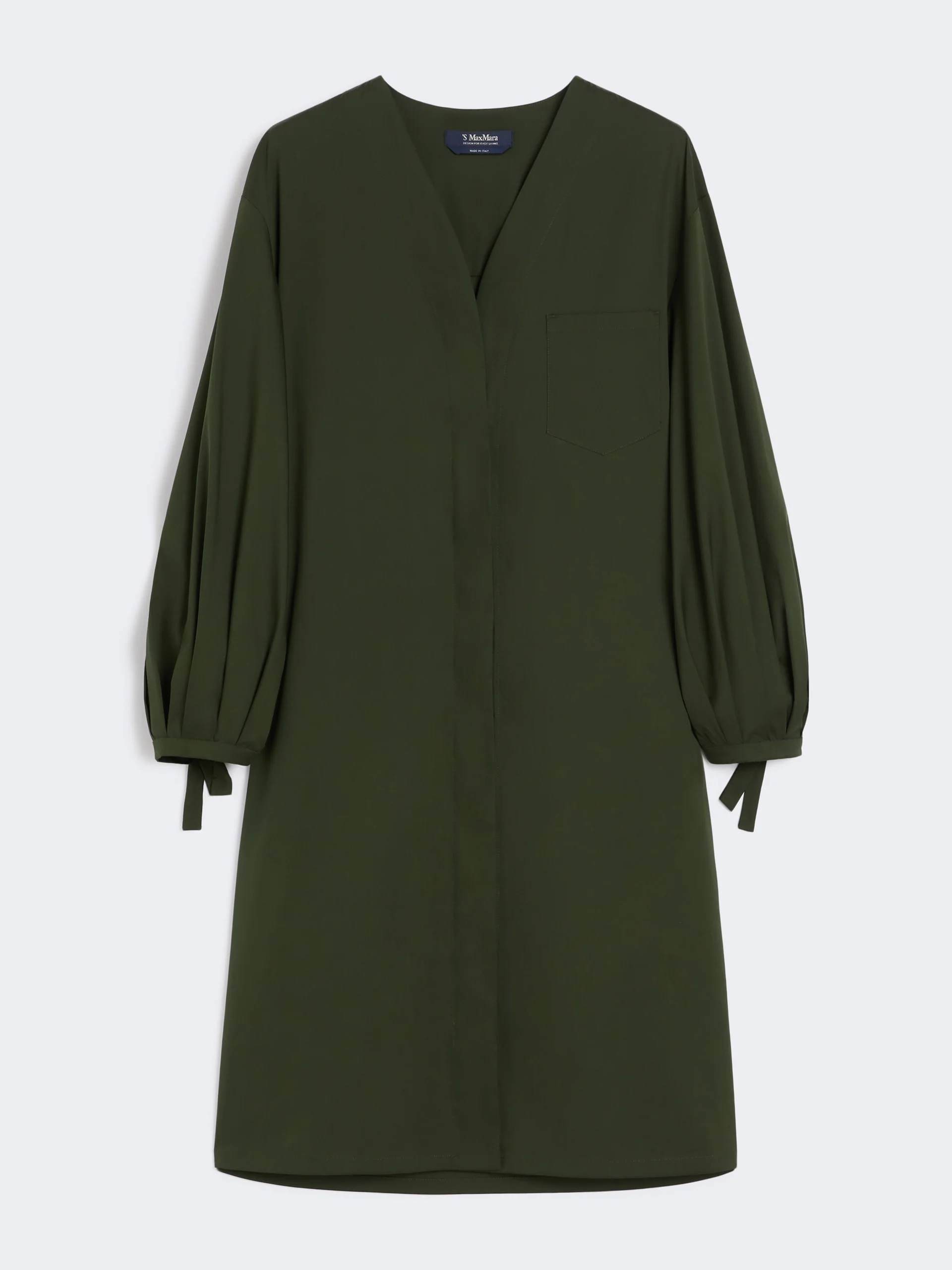 DETAILS Short dress with small patch pocket and puffed sleeves with ribbon fastening at the cuffs. Stretch cotton poplin dress Straight cut V neck Front fastening with concealed mother-of-pearl buttons Yoke seam and double darts on the back COMPOSITION AND CARE 80% cotton, 18% polyamide, 2% elastane. Machine wash cold delicate cycle; do not bleach; do not tumble dry; line drying in the shade; cool iron; professionally dry clean perchloroethylene - mild process.; wash the garment while it is fastened.; contains non-textile parts of animal origin. Distributed by Max Mara S.r.l., registered office in Reggio Emilia (Italy), Via Giulia Maramotti 4, 42124 (IT)