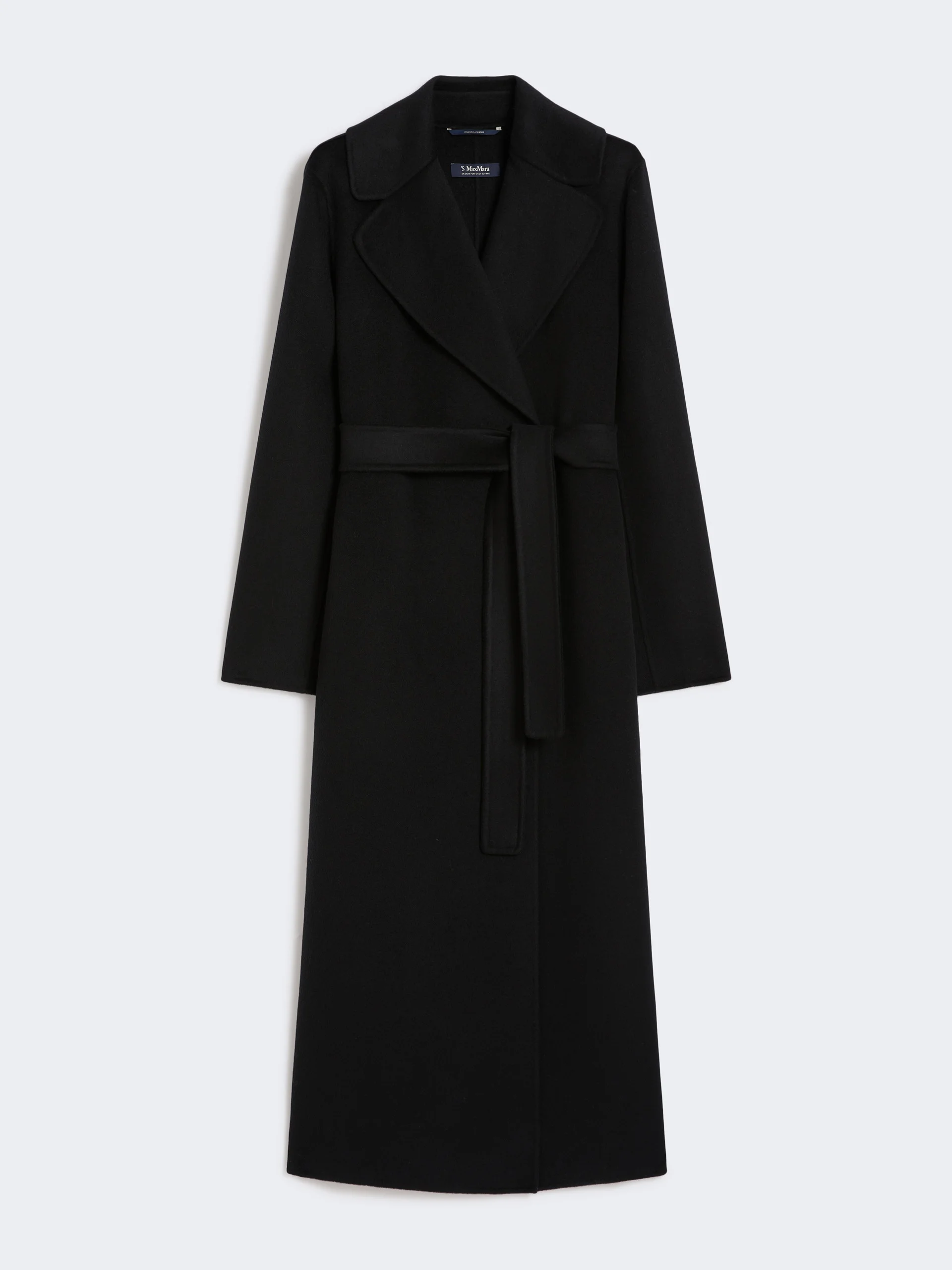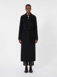 DETAILS Long wrap coat with deep central slit on the back. Coat made from hand-sewn wool and cashmere drap Straight cut Lapel collar Set-in sleeves with small slit at the cuffs Fastens with a matching belt Side inset pockets Semi-lined with silk sleeves COMPOSITION AND CARE Fabric 70% virgin wool, 30% cashmere; fabric except joining thread; lining 100% silk. Do not wash; do not bleach; do not tumble dry; cool iron; professionally dry clean perchloroethylene - mild process; do not wet clean. Distributed by Max Mara S.r.l., registered office in Reggio Emilia (Italy), Via Giulia Maramotti 4, 42124 (IT)