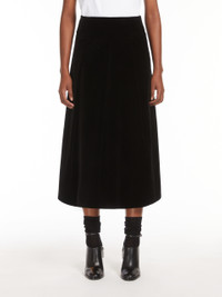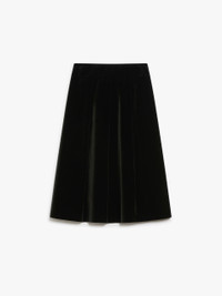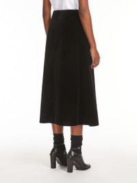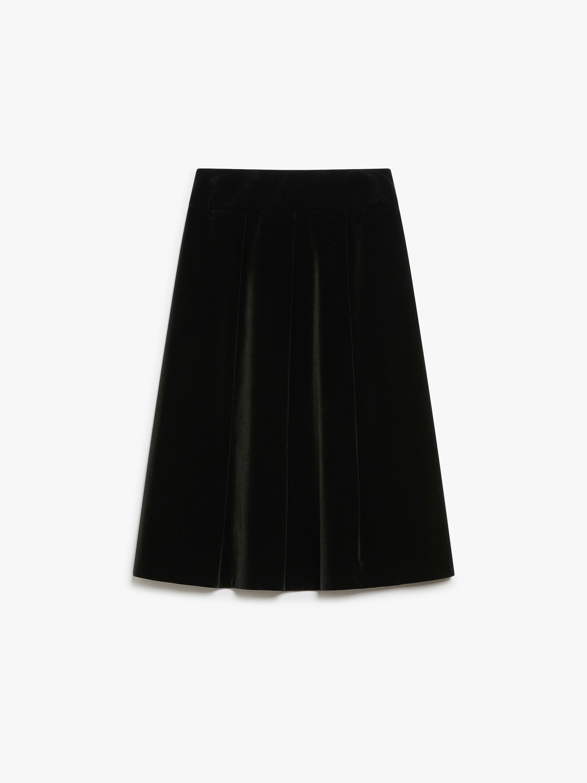 DETAILS Long skirt with a flared line, made of soft and smooth pure cotton velvet. The silhouette features a triple pleat motif on the front and a wide belt at the waist. The lined style closes with a concealed central zip at the back. COMPOSITION AND CARE Fabric 100% cotton; lining 61% acetate, 39% viscose. Do not wash; do not bleach; do not tumble dry; cool iron; professionally dry clean perchloroethylene - mild process; do not wet clean. Distributed by Max Mara S.r.l., registered office in Reggio Emilia (Italy), Via Giulia Maramotti 4, 42124 (IT)