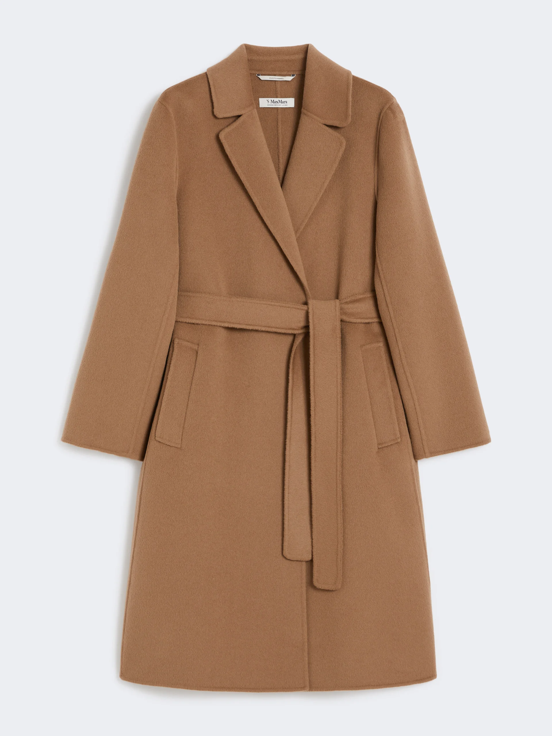 DETAILS Regular-fit midi robe coat. Coat in hand-sewn double-faced pure wool broadcloth Lapel collar Long set-in sleeves with hem slit detail Matching belt Welt side pockets Central rear vent Unlined model COMPOSITION AND CARE Fabric 100% virgin wool; - except joining thread; lining 100% silk. Do not wash; do not bleach; do not tumble dry; cool iron; professionally dry clean perchloroethylene - mild process; do not wet clean. Distributed by Max Mara S.r.l., registered office in Reggio Emilia (Italy), Via Giulia Maramotti 4, 42124 (IT)