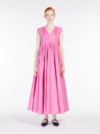 DETAILS Long sleeveless dress made of an exquisite combination of cotton cloth and ramie organza. The garment features a flared silhouette with flat pleats on the bodice and waist that open out at the hem. Features a V neck at the front and back, and long ribbons to tie at the back. Concealed zip fastening on the back. COMPOSITION AND CARE Fabric 70% ramie, 30% cotton; lining 100% cotton. Hand wash cold; do not bleach; do not tumble dry; line drying in the shade; cool iron; professionally dry clean perchloroethylene - mild process; do not wet clean. Distributed by Max Mara S.r.l., registered office in Reggio Emilia (Italy), Via Giulia Maramotti 4, 42124 (IT)