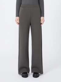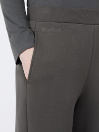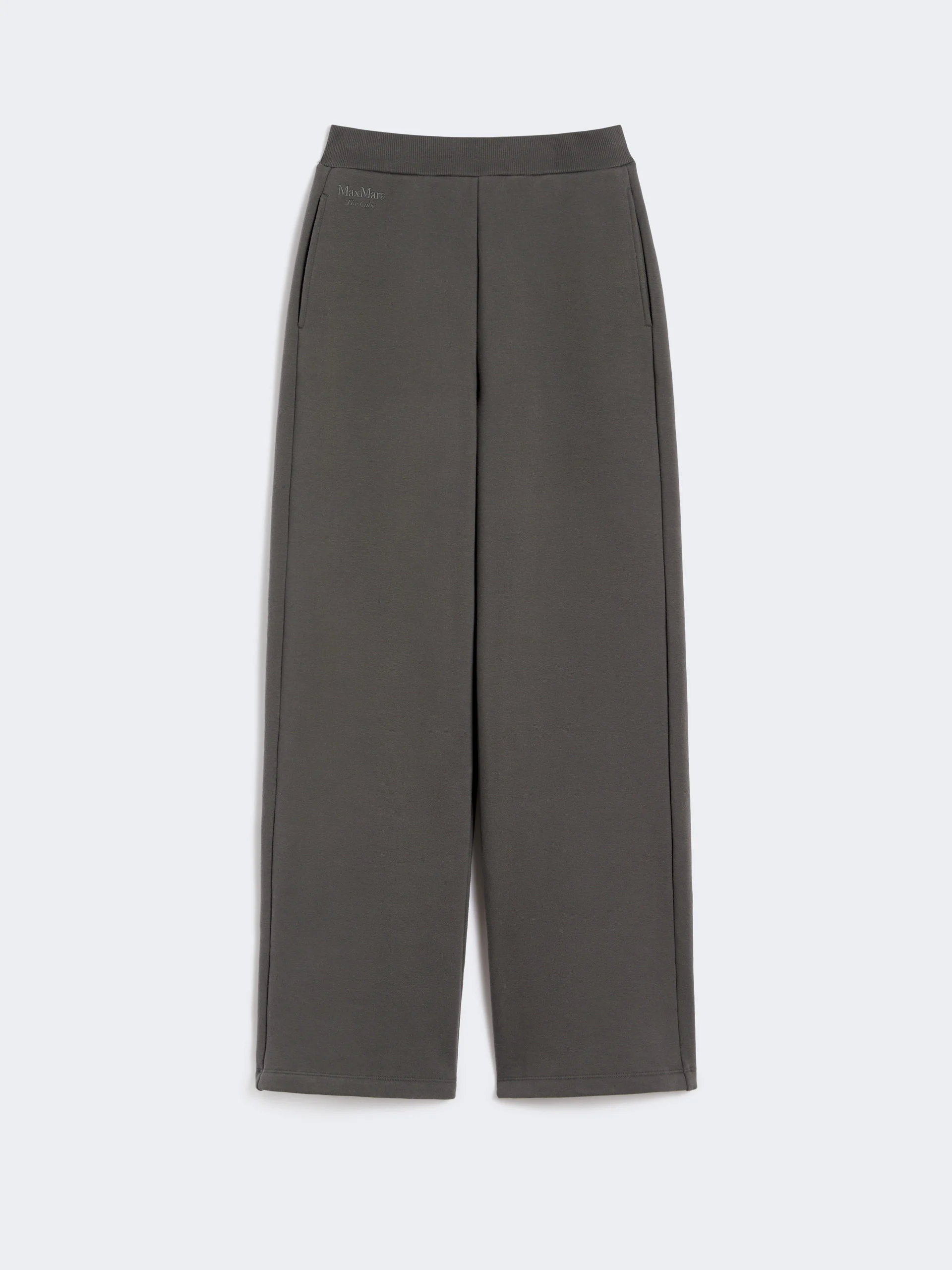 DETAILS Relaxed-fit trousers. Brushed cotton jersey trousers Ribbed elasticated waistband Side pockets Welt pocket on the rear right-hand side Small embroidered logo above the right pocket COMPOSITION AND CARE Jersey fabric 88% cotton, 8% polyamide, 4% elastane; - exclusive of embroideries. Machine wash cold delicate cycle; do not bleach; do not tumble dry; flat drying in the shade; cool iron; professionally dry clean perchloroethylene - mild process; professional wet cleaning - very mild process.; iron with a cloth between.; using neutral detergent.; turn the articles inside out before washing.; to be ironed on reverse. Distributed by Max Mara S.r.l., registered office in Reggio Emilia (Italy), Via Giulia Maramotti 4, 42124 (IT)