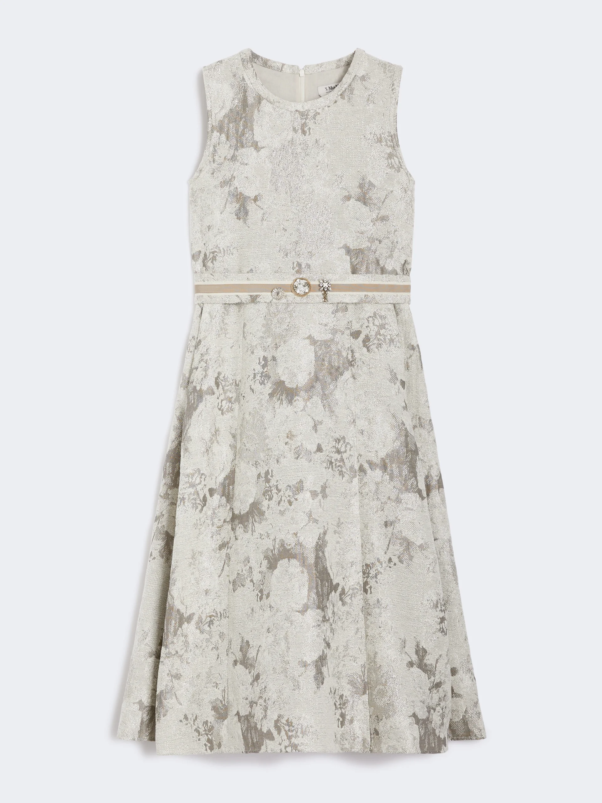 DETAILS Sleeveless midi dress with waist seam and skirt with small pleats. Cotton-blend and lurex jacquard dress Flared Back zip fastening Side inset pockets Adjustable belt with snap buttons Removable jewel appliques on the belt Lined COMPOSITION AND CARE Fabric 61% cotton, 34% polyester, 4% metallic fiber, 1% flaxlinen; lining 100% cotton; - exclusive of decoration. Do not wash; do not bleach; do not tumble dry; cool iron; professionally dry clean perchloroethylene - mild process; do not wet clean.; do not iron the ribbons.; remove the decorations before washing. Distributed by Max Mara S.r.l., registered office in Reggio Emilia (Italy), Via Giulia Maramotti 4, 42124 (IT)