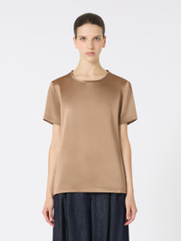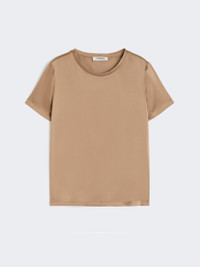 DETAILS Basic T-shirt with an essential yet versatile style. Viscose-blend satin T-shirt Straight fit Crew-neck Short set-in sleeves COMPOSITION AND CARE 64% acetate, 36% viscose. Do not wash; do not bleach; do not tumble dry; cool iron; professionally dry clean perchloroethylene - mild process; do not wet clean. Distributed by Max Mara S.r.l., registered office in Reggio Emilia (Italy), Via Giulia Maramotti 4, 42124 (IT)
