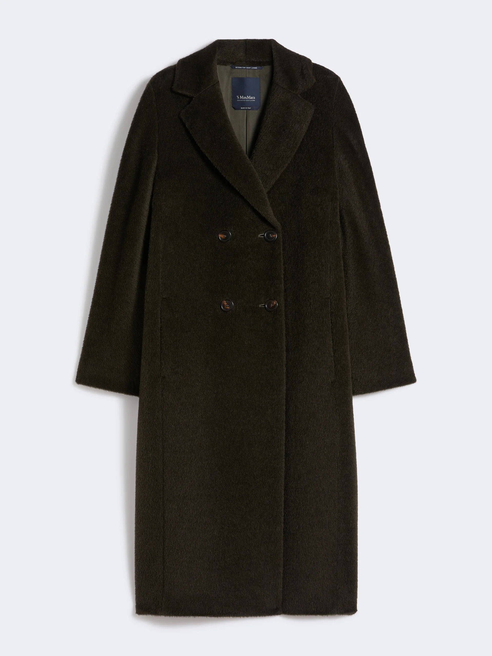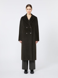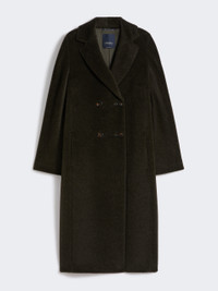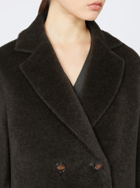 DETAILS Tailoring-style long double-breasted coat. Coat in wool and alpaca fabric with a soft and ultra-fluffy texture Cocoon fit Lapel collar Set-in sleeves on the front and kimono sleeves at the back Horn button fastening on the front In-seam side pockets Lined model COMPOSITION AND CARE Fabric 62% alpaca, 38% virgin wool; lining 69% acetate, 31% cupro. Do not wash; do not bleach; do not tumble dry; cool iron; professionally dry clean perchloroethylene - mild process; do not wet clean.; wash the garment while it is fastened.; do not iron the buttons.; protect buttons before washing.; turn the articles inside out before washing.; contains non-textile parts of animal origin. Distributed by Max Mara S.r.l., registered office in Reggio Emilia (Italy), Via Giulia Maramotti 4, 42124 (IT)