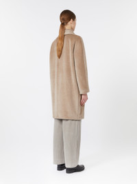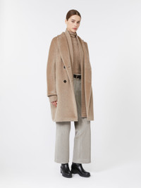 DETAILS Midi coat featuring a cocoon fit that tapers slightly at the hem. Coat in wool and alpaca fabric with a soft and ultra-fluffy texture Lapel collar Set-in sleeves on the front and kimono sleeves at the back Double-breasted visible horn button fastening In-seam side pockets Lined model COMPOSITION AND CARE Fabric 62% alpaca, 38% virgin wool; lining 69% acetate, 31% cupro. Do not wash; do not bleach; do not tumble dry; cool iron; professionally dry clean perchloroethylene - mild process; do not wet clean.; wash the garment while it is fastened.; do not iron the buttons.; protect buttons before washing.; turn the articles inside out before washing.; contains non-textile parts of animal origin. Distributed by Max Mara S.r.l., registered office in Reggio Emilia (Italy), Via Giulia Maramotti 4, 42124 (IT)
