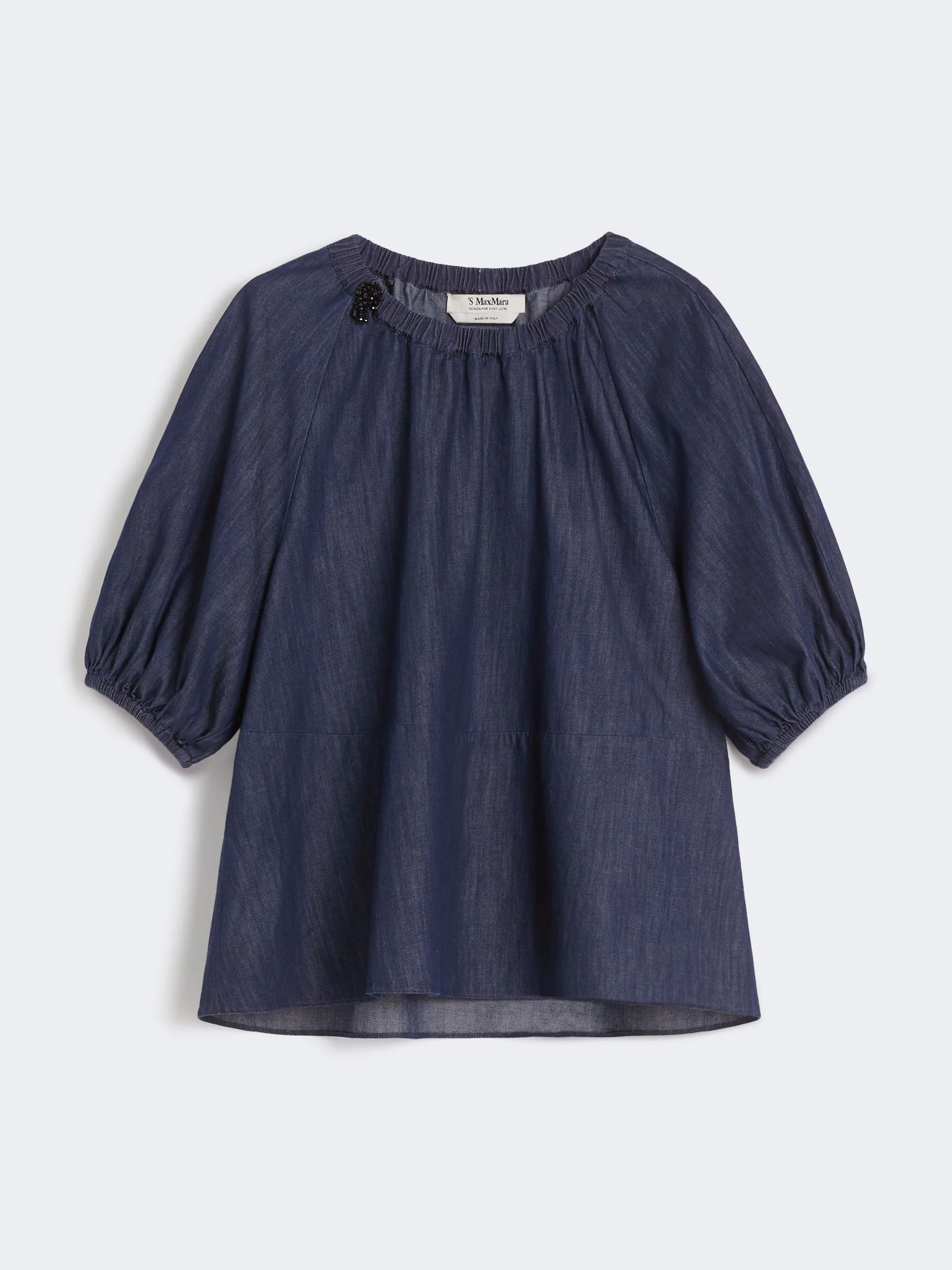 DETAILS Slightly loose Blouse with a waist seam at the front and back. - Garment-washed pure cotton denim blouse - Flared - Elasticated crew neck with gathered motif - Short raglan balloon sleeves - Elasticated cuffs - Jewel applique on the neck COMPOSITION AND CARE Fabric 100% cotton; - exclusive of decoration. Machine wash cold delicate cycle; do not bleach; do not tumble dry; line drying in the shade; cool iron; professionally dry clean perchloroethylene - mild process.; remove the decorations before washing.; take care when wearing light-coloured clothes or accessories because, with the heat of the body, the indigo fabric , may fade and stain. be careful while sitting on light coloured surfaces, especially if wet. wash garments separately and always turned inside out. hang the garment turned inside out by avoiding to expose it to direct sunlight. avoid removing isolated stains. Distributed by Max Mara S.r.l., registered office in Reggio Emilia (Italy), Via Giulia Maramotti 4, 42124 (IT)