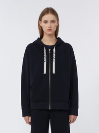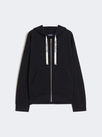 DETAILS Drawstring-hood sweatshirt with branded jacquard ribbons. - Technical cotton jersey sweatshirt - Boxy style - Long low set-in sleeves - Front zip fastening - Kangaroo front pocket - Rib-knit cuffs and trim COMPOSITION AND CARE 78% cotton, 22% polyester. Machine wash cold delicate cycle; do not bleach; do not tumble dry; flat drying in the shade; cool iron; professionally dry clean perchloroethylene - mild process; professional wet cleaning - very mild process.; iron with a cloth between.; using neutral detergent.; protect accessories before washing.; turn the articles inside out before washing.; to be ironed on reverse. Distributed by Max Mara S.r.l., registered office in Reggio Emilia (Italy), Via Giulia Maramotti 4, 42124 (IT) Collection: 'S Max Mara Product code: 9921036106005 - SMMJOUR