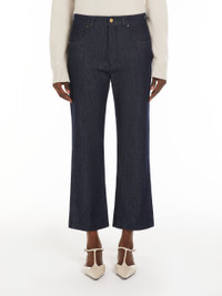 DETAILS Kapok and cotton indigo denim trousers featuring a leg that flares slightly towards the hem. Five-pocket style finished with matching stitching and metallic rivets. Concealed fastening with zip and metal tack button. COMPOSITION AND CARE 93% cotton, 7% kapok. Machine wash cold delicate cycle; do not bleach; do not tumble dry; line drying in the shade; cool iron; professionally dry clean perchloroethylene - mild process.; wash the garment while it is fastened.; turn the articles inside out before washing.; take care when wearing light-coloured clothes or accessories because, with the heat of the body, the indigo fabric , may fade and stain. be careful while sitting on light coloured surfaces, especially if wet. wash garments separately and always turned inside out. hang the garment turned inside out by avoiding to expose it to direct sunlight. avoid removing isolated stains. Distributed by Max Mara S.r.l., registered office in Reggio Emilia (Italy), Via Giulia Maramotti 4, 42124 (IT)