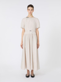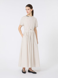 DETAILS Long dress featuring a volume-bestowing pleated skirt and a bejewelled embroidery-decorated neckline. Washed cotton poplin dress Flared fit Slightly gathered crew neckline Elasticated-hem short puff sleeves Concealed zip fastening at the back Comes with an elastic, leather and fabric belt Unlined model COMPOSITION AND CARE Fabric 100% cotton; - exclusive of decoration. Machine wash cold delicate cycle; do not bleach; do not tumble dry; line drying in the shade; cool iron; professionally dry clean perchloroethylene - mild process.; remove the belt before washing.; remove the decorations before washing. Distributed by Max Mara S.r.l., registered office in Reggio Emilia (Italy), Via Giulia Maramotti 4, 42124 (IT)
