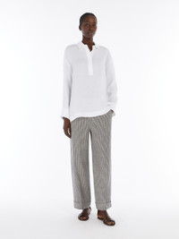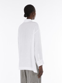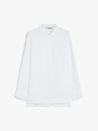 DETAILS Long-sleeved shirt in washed pure linen canvas. The garment features a polo-style collar, dropped shoulders and shirt cuffs with buttons. Asymmetrical hem, slightly longer at the back, with side slits. Small front closure with concealed buttons. COMPOSITION AND CARE 100% flaxlinen. Machine wash cold delicate cycle; do not bleach; do not tumble dry; line drying in the shade; cool iron; professionally dry clean perchloroethylene - mild process.; wash the garment while it is fastened.; turn the articles inside out before washing.; contains non-textile parts of animal origin. Distributed by Max Mara S.r.l., registered office in Reggio Emilia (Italy), Via Giulia Maramotti 4, 42124 (IT)