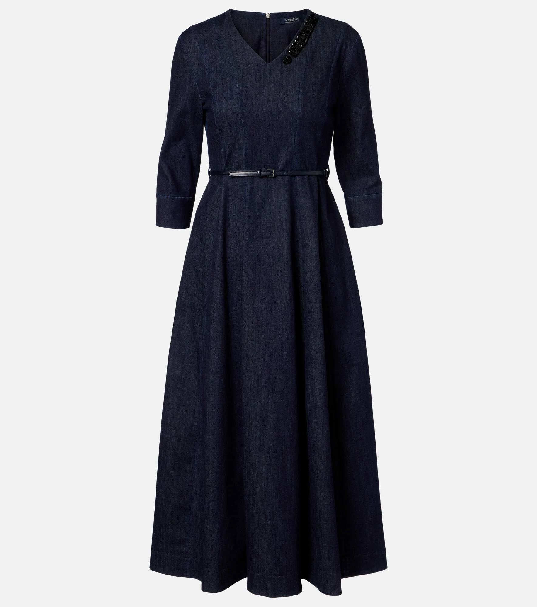 'S Max Mara conveys contemporary elegance through streamlined silhouettes and premium fabrics. The Vela denim midi dress is adorned with shimmering embellishments along the V-neckline and finished with a detachable belt that defines the waist. Product Details - Material: 66% cotton, 16% lyocell, 16% polyester, 2% elastane - Care instructions: machine wash at 30 degrees - Made in Tunisia - Color: blue - Designer color name: Scuro Pulio - Lining: 100% cotton - Closure: concealed zipped back - Pockets: side slit pockets - Detachable belt - Belt loops - Item number: P01125847 Size & Fit - True to size - Cinched waist - Adjustable at the waist - Slightly stretchy fabric - The model seen in the picture is 178cm-5'10" and wearing a size DE 34