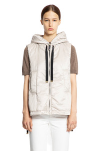 DESCRIPTION - Light grey - Upcycled nylon - Padded - Water-repellent - Hood with drawstrings - Zip closure - Side pockets - Sleeveless - Drawstring hem DETAILS - Made in: Italy - Composition: 100% Polyester Padding: Polyester/Wool/Silk - Model code: 2529296024600 003 - Item ID: 9719296754006 SIZE & FIT Model wears size 38 Model Height 178 cm Bust 84 cm Waist 60 cm Hips 88 cm