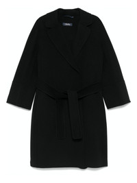 wool coat Highlights - 's max mara "arona" coat, black, short, double wool, hand-sewn, cocoon silhouette with cut at waist on back, wide line slightly closed at hem, small lapels, kimono sleeves, raglan on back, fastening with matching belt, side welt pockets, unlined, regular fit, professional cleaning recommended100% wool; Imported Composition Virgin Wool 100% SIZE & FIT Model measurements Height 5 ft 11 in(1.8 m) Bust/Chest 31.49 in(80 cm) Hips 36.61 in(93 cm) Waist 24.4 in(62 cm) FittingInformation Designed for a slim fit that sits just away from the body offering a close yet comfortable fit The belt offers adjustability for fitted preferences Made from a midweight non-stretch fabric