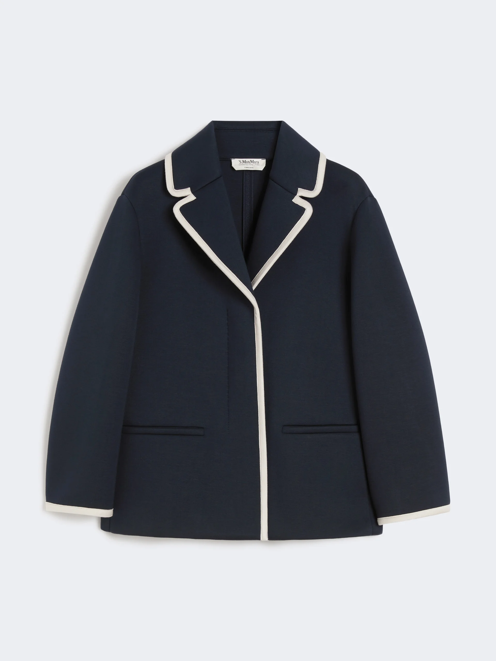 DETAILS Single-breasted jacket with contrasting trim on collar and cuffs. - Bonded viscose jersey jacket - Boxy fit - Lapel collar - Long set-in sleeves - Concealed front fastening - Horizontal welt pockets at the front - Unlined COMPOSITION AND CARE 96% viscose, 4% elastane. Hand wash cold (40°c max); do not bleach; do not tumble dry; drip line drying in the shade; cool iron; do not dry clean; do not wet clean.; iron with a cloth between.; using neutral detergent.; don’t rub.; turn the articles inside out before washing.; to be ironed on reverse. Distributed by Max Mara S.r.l., registered office in Reggio Emilia (Italy), Via Giulia Maramotti 4, 42124 (IT)
