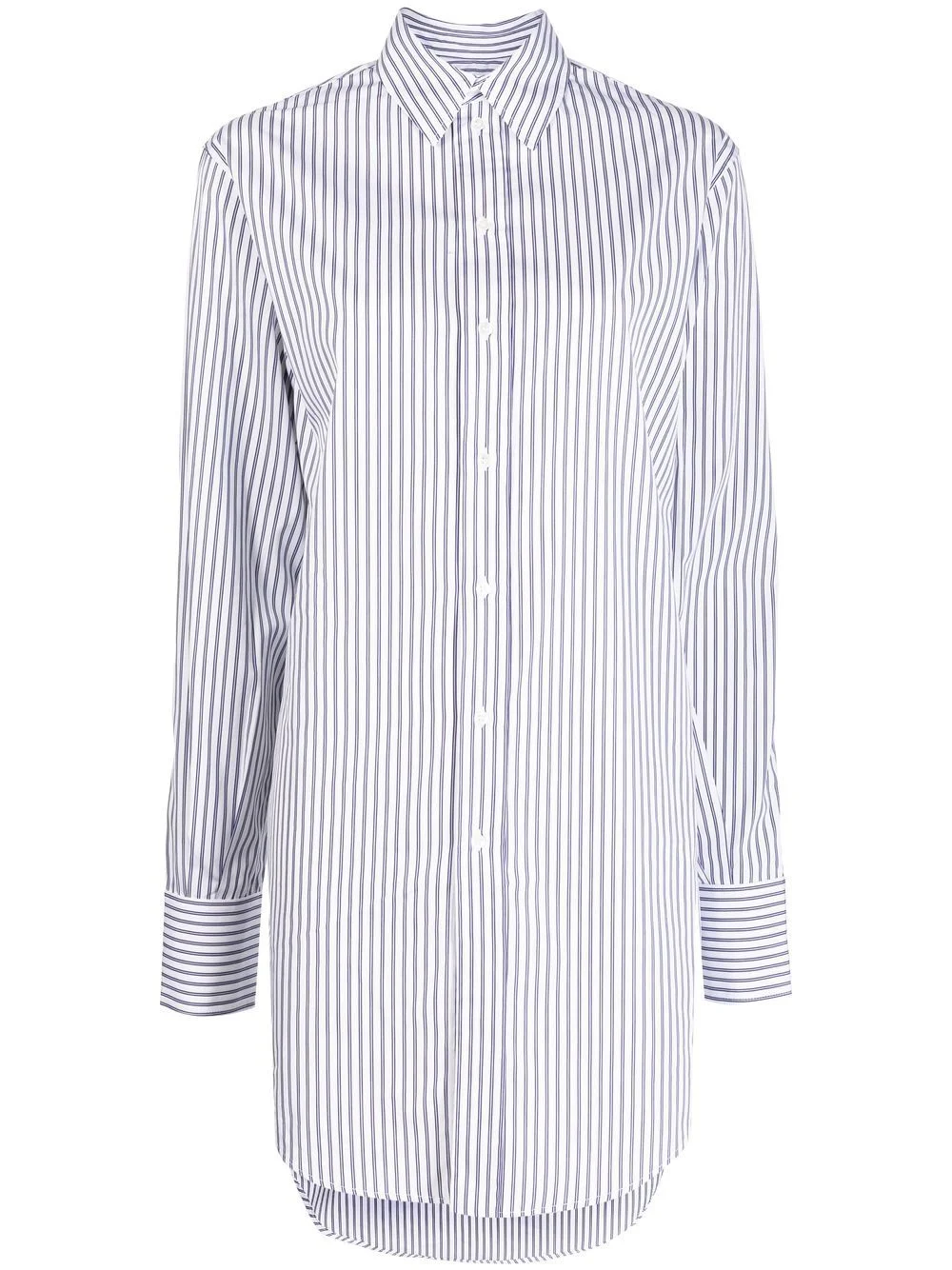 striped silk shirt dress Highlights - Blue/white - Silk - Poplin texture - Vertical stripe pattern - Classic collar - Front button fastening - Long sleeves - Buttoned cuffs - Curved hem Made in Italy Composition Silk 100% SIZE & FIT Model measurements Height 5 ft 10 in(1.77 m) Bust/Chest 31.49 in(80 cm) Hips 35.43 in(90 cm) Waist 25.19 in(64 cm) FittingInformation This piece fits true to size. We recommend you get your regular size Cut for a loose fit Made with a mid-weight non-stretch fabric Washing instructions Machine Wash