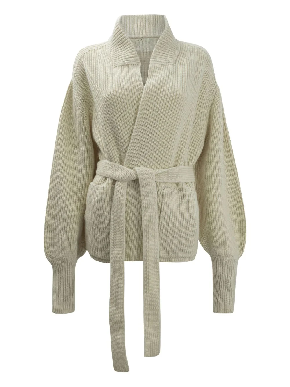 tie-waist cardigan Highlights - White - Tie fastening - Ribbed knit - Long sleeves - Shawl collar - Balloon sleeves Made in Italy Composition Cashmere 100% Washing instructions Read Manufacturer Guidelines