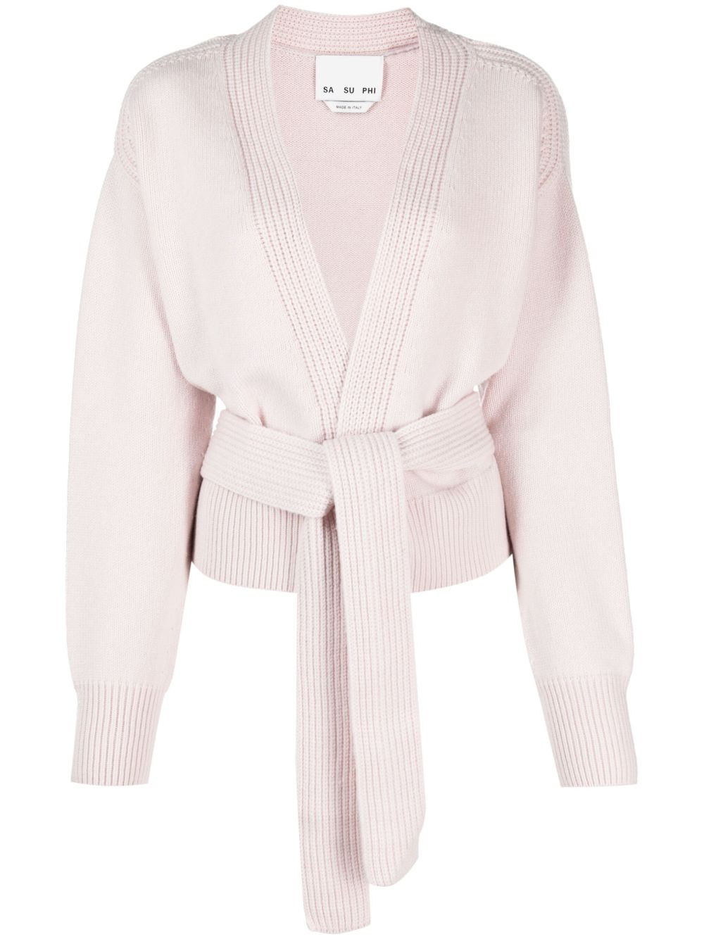belted ribbed-knit cardigan Highlights - Light pink - Wool-cashmere blend - Fine knit - Ribbed-knit edge - V-neck - Front tie fastening - Long sleeves - Belted waist - Straight hem Made in Italy Composition Wool 70%, Cashmere 30%