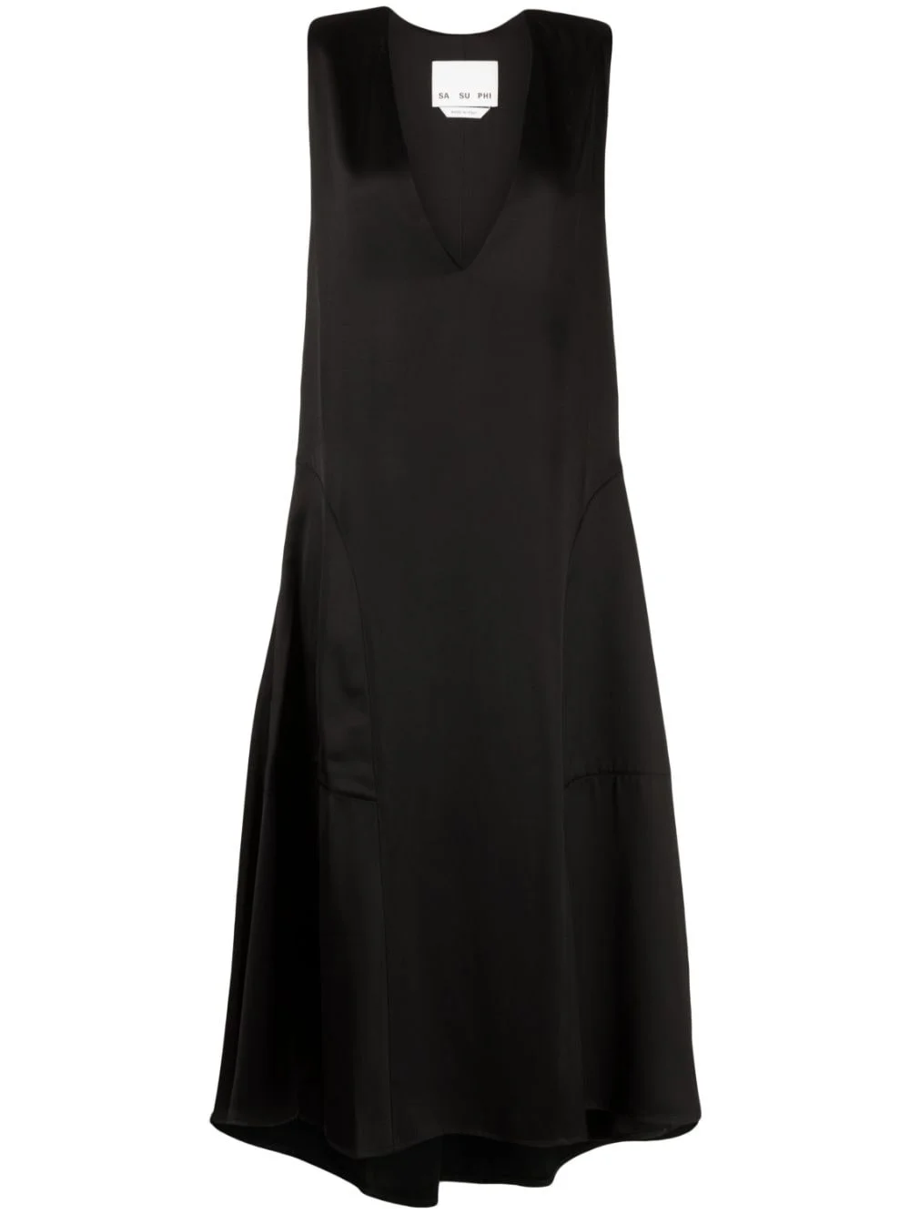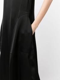 V-neck sleeveless satin dress Highlights - Black - Satin finish - Silk blend - V-neck - Sleeveless - Two side inset pockets - Knee-length - High-low hem Made in Italy Composition Body: Silk 57%, Viscose 43% SIZE & FIT Model measurements Height 5 ft 9 in(1.76 m) Bust/Chest 31.1 in(79 cm) Hips 35.03 in(89 cm) Waist 24.4 in(62 cm)