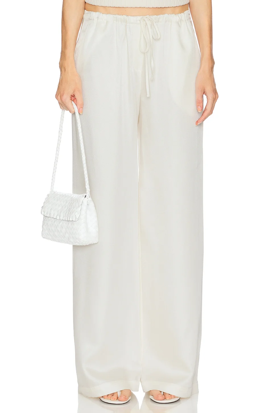 - 77% viscose 23% rayon - Made in USA - Dry clean only - Elastic waistband with self-tie closure.4-pocket styling - Silky twill fabric - Item not sold as a set.23" at the knee breaks to 23.5" at the leg opening - Revolve Style No. SLYN-WP15 - Manufacturer Style No. GEMMA2501