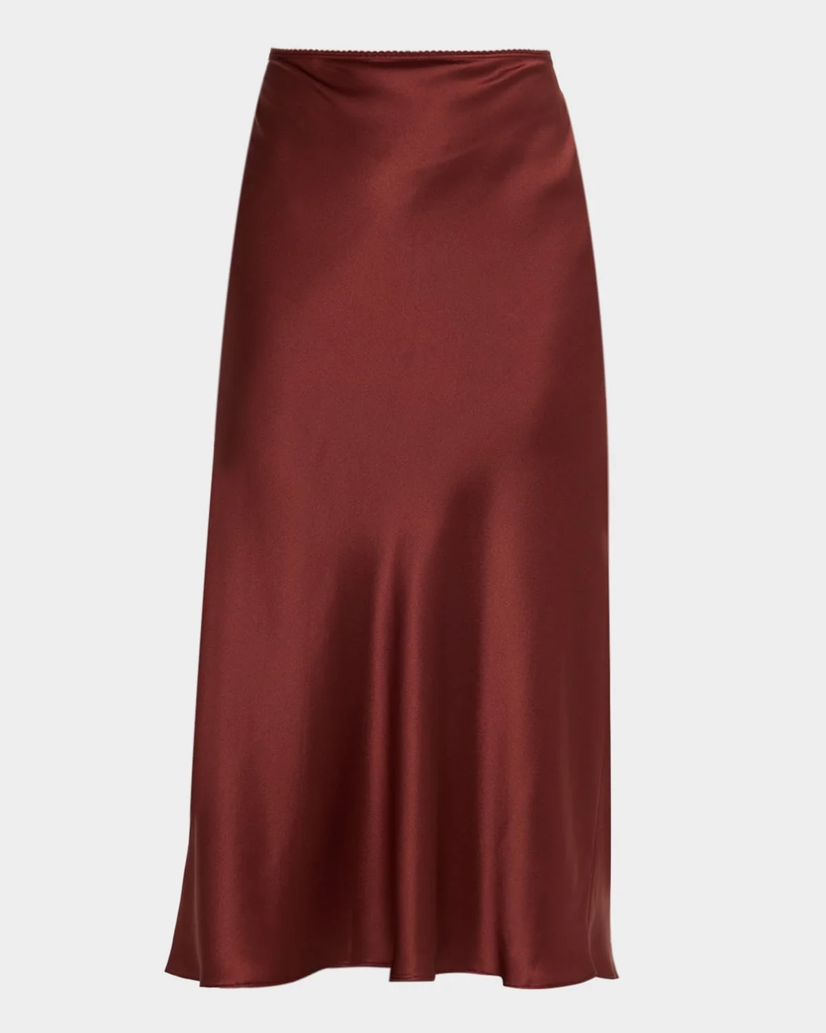 Sablyn "Miranda" biascut lustrous silk skirt Highrise waistband Hem falls below the knee Aline silhouette Slipon style Silk Made in USA