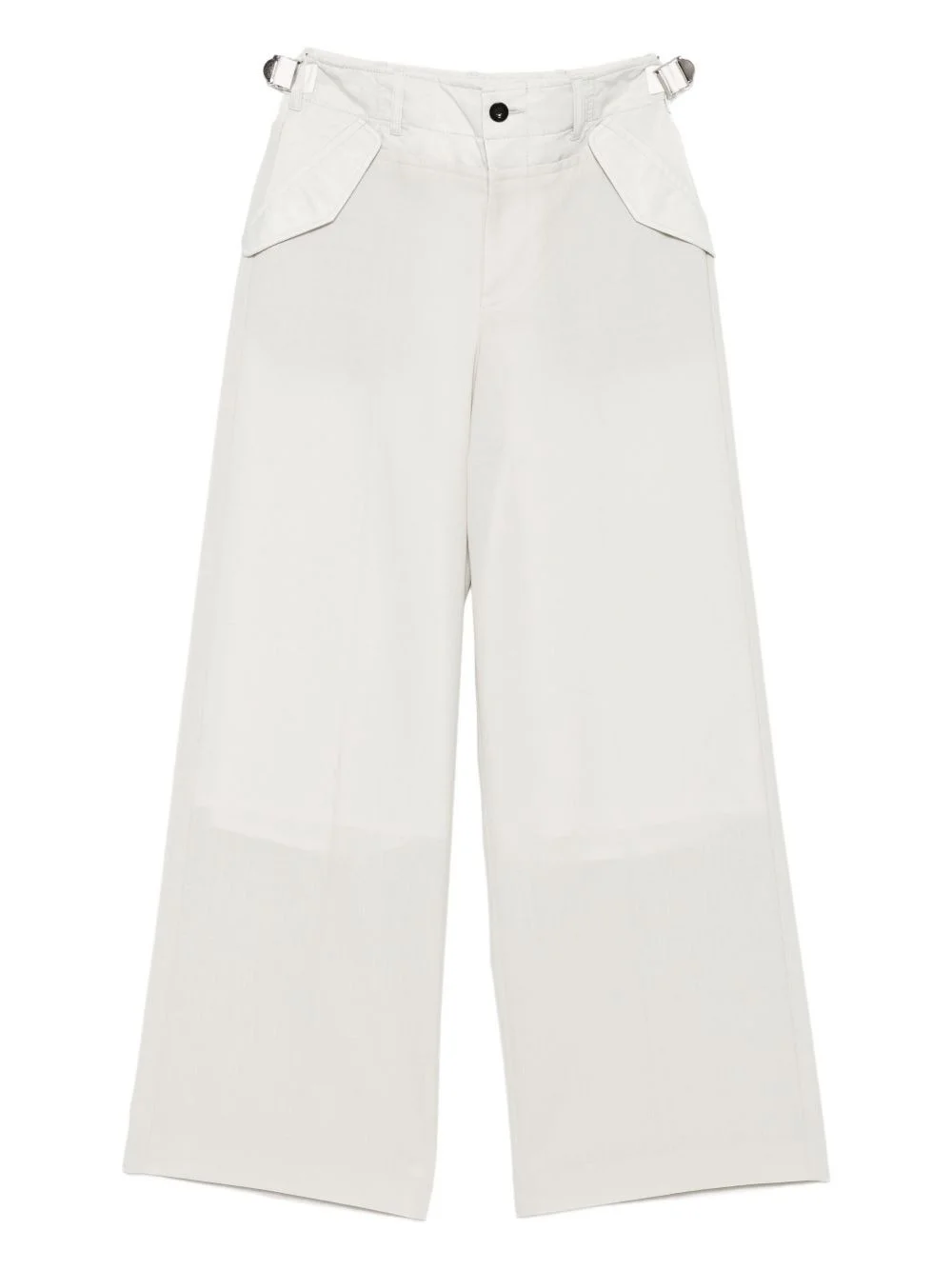 adjustable-waist flap-pocket trousers Highlights - Beige - Side flap-pockets - Belt loops - Button fastening - Side adjusters Imported Composition Nylon 100%, Cupro 100%, Polyester 70%, Wool 30% SIZE & FIT Model measurements Height 5 ft 9 in(1.75 m) Bust/Chest 34.64 in(88 cm) Hips 36.61 in(93 cm) Waist 26.37 in(67 cm) Washing instructions Dry Clean Only