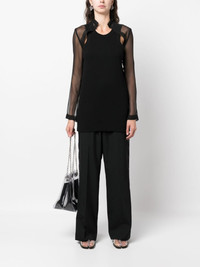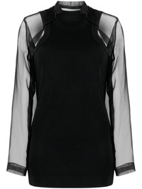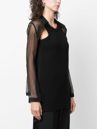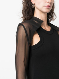 layered cut-out top sacai's layered top showcases the brand's eye for fusing casual and refined design codes. A sheer organza shirt extends down the arms and back, overlaying the sporty ribbed tank base and creating cut-outs at the front shoulders. Highlights - Black - Cotton blend - Fine ribbed - Chiffon - Layered design - Round neck - Stand-up collar - Cut-out sleeves - Long sheer sleeves Imported Composition Polyester 100%, Cotton 95%, Polyurethane 5% SIZE & FIT Model measurements Height 5 ft 9 in(1.76 m) Bust/Chest 33.07 in(84 cm) Hips 34.64 in(88 cm) Waist 25.59 in(65 cm) FittingInformation Designed for a slim fit that sits just away from the body offering a close yet comfortable fit Made from a midweight fabric This piece fits true to size – take your usual size Washing instructions Dry Clean Only