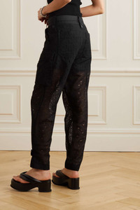 EDITORS'NOTES Sacai's straight-leg pants are made from cotton-blend broderie anglaise - a closer look reveals the moniker spelt out on repeat. Partially lined for coverage, they have buttoned tabs at the cuffs and are threaded with a coordinating belt through the high-rise waist. SIZE & FIT - Size 1 = XS, 2 = S, 3 = M, 4 = L - Fits true to size, take your normal size - High-rise, intended for a straight-leg fit - Lightweight, non-stretchy fabric - Model is 175cm/ 5'9" and is wearing the designer's size 2 DETAILS & CARE - Black cotton-blend broderie anglaise - Concealed button and zip fastenings at front - 50% cotton, 50% polyester; trim: 100% rayon - Dry clean - Mother-of-pearl: Ecuador