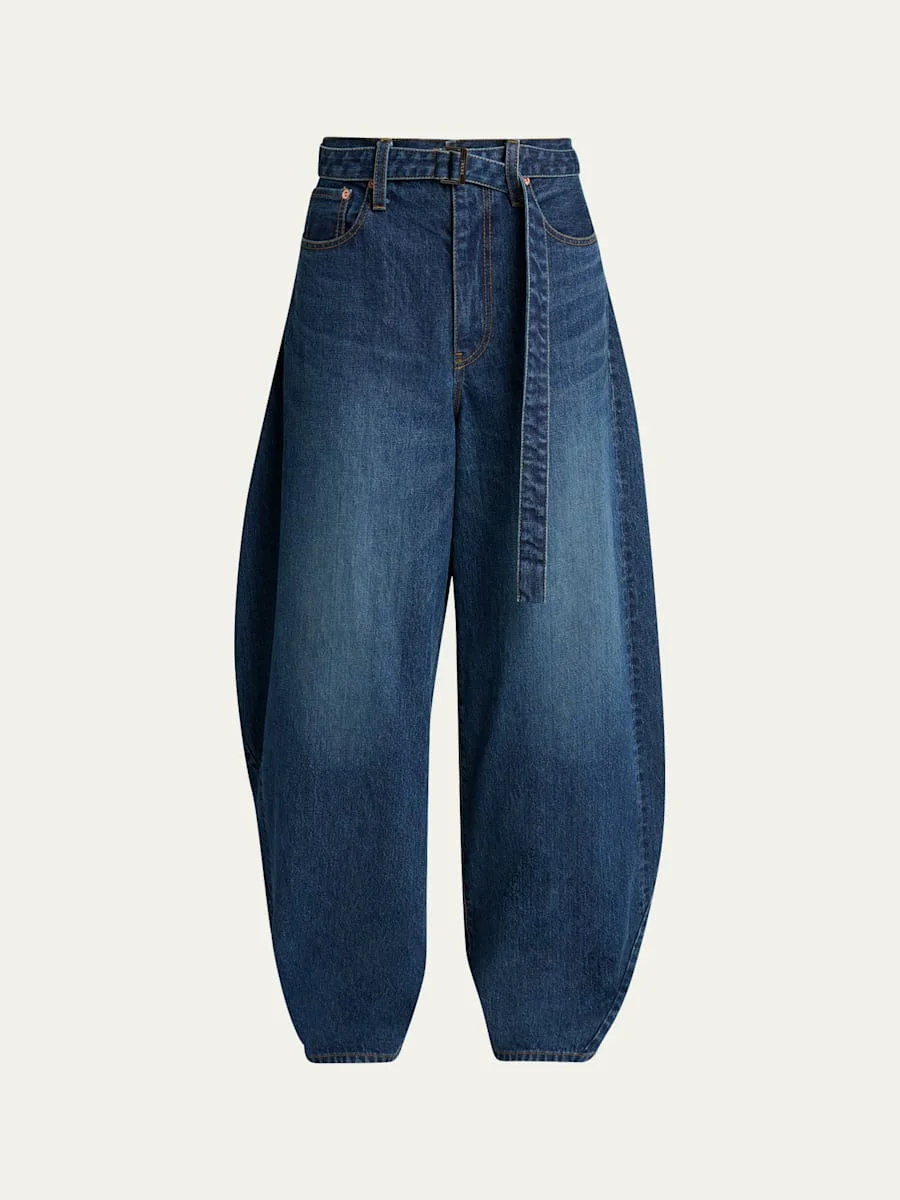 Crafted from darkwashed denim, these pants from SACAI feature side panels creating exaggerated curved legs, slight fading and whiskering, and a self belt Mid rise sits high on hip Fivepocket style Barrel legs Full lnegth Button/zip fly; belt loops Cotton Dry clean Made in Japan