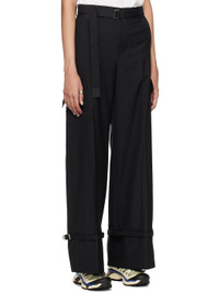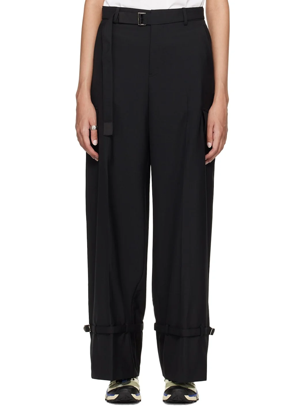 Polyester- and wool-blend broadcloth trousers. · Belt loops · Detachable cinch belt at waistband and cuffs · Four-pocket styling · Zip-fly · Creased legs · Flap pocket at outseams · Partial cupro satin lining Supplier color: Black Body: 70% polyester, 30% wool. Lining: 100% cupro. Made in Japan 242445F087004