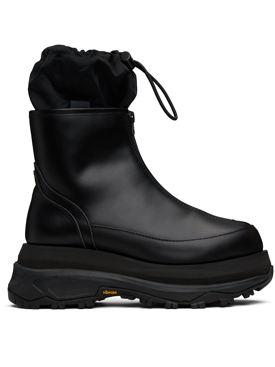 Ankle-high paneled buffed leather and twill boots. · Zip closure at vamp · Bungee-style drawstring at collar · Grosgrain pull-loops at heel collar · Foam rubber platform midsole · Treaded Vibram® rubber sole · Platform: H3" Supplier color: Black Upper: leather, textile. Sole: rubber. Made in Japan 252445F113001
