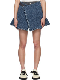 Needle-punched non-stretch denim skort. Frayed edges throughout. · Wrap construction · Button fastening at waistband · Two-pocket styling · Inverted box pleats at hem · Partial satin lining · Belt loops, zip fly, and mock pockets at shorts · Logo-engraved silver-tone hardware · Contrast stitching in tan Supplier color: Indigo Body: 100% cotton. Trim: 100% cotton. Lining: 100% cupro. Made in Japan 251445F088003