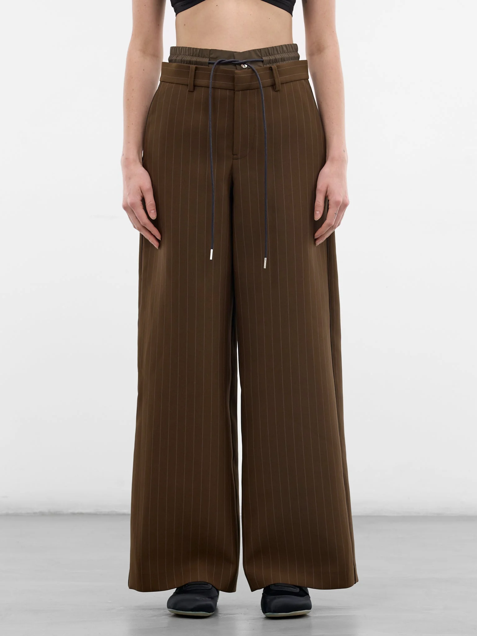 Brown trousers constructed from matelasse twill with a layered double waistband and wide-leg silhouette. Featuring: • Baggy fit • Matelasse twill construction • Pinstripe pattern • High-waisted silhouette • Layered double waistband • Elasticated drawstring waistband • Secondary waistband with belt loops • Front button and zip fly closure • Inset pockets • Back welt pockets • Fully lined • Wide leg • Made in Japan • Main: 99% Polyester 1% Rayon | Lining: 100% Polyester • Japanese sizing Model is 5'8" wearing size 1. Bust: 32” Waist: 25” Hips: 35”