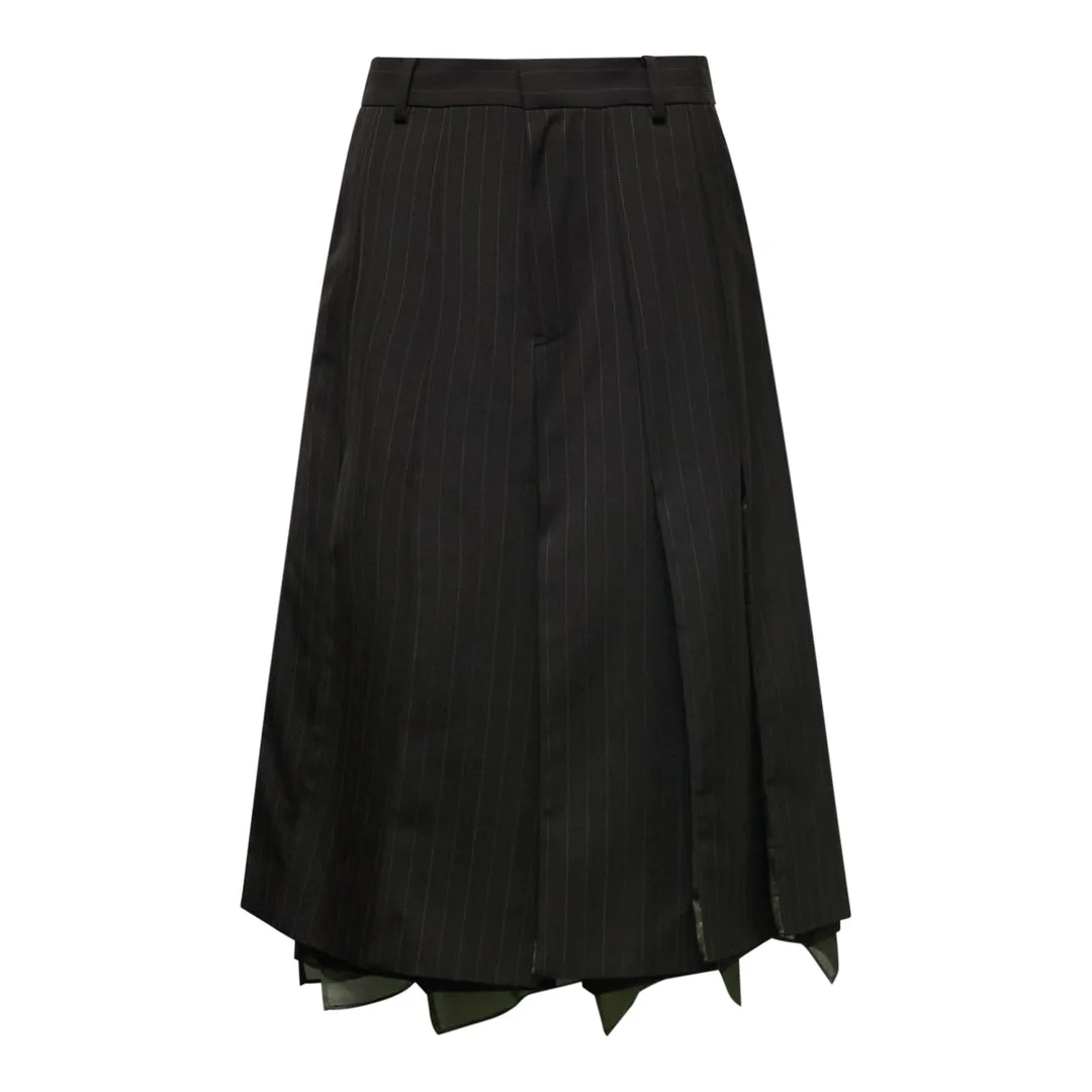 600078438BRN000 / 26-08360/00/601 - High-waisted design with belt loops - Chalk pinstripe pattern on charcoal wool - Pleated front panels - Asymmetrical layered construction - Contrasting fabric panels at hem - Side zip closure - A-line silhouette - Premium wool suiting fabric The sacai Chalk Stripe Skirt delivers avant-garde femininity with the brand's signature hybrid construction and architectural tailoring. Crafted from premium wool suiting fabric in deep charcoal with contrasting chalk pinstripes, featuring pleated detailing and asymmetrical layered panels. The deconstructed silhouette and innovative fabric mixing create a sophisticated statement piece that embodies sacai's experimental design philosophy.