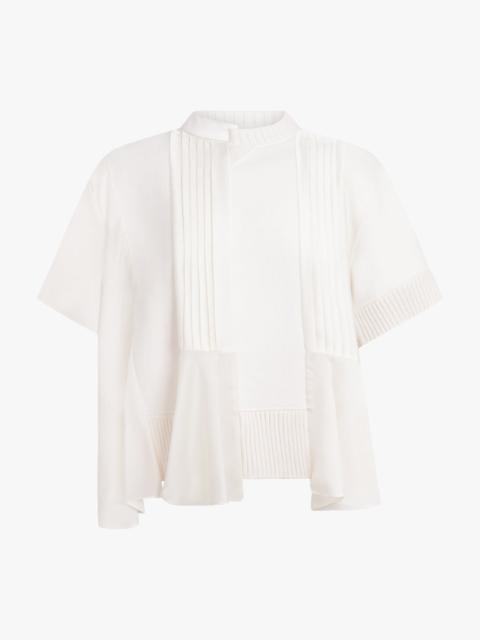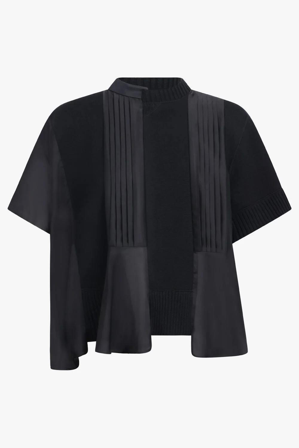 A refined everyday essential, this Sacai pullover reflects the brand’s signature approach to hybrid design. The relaxed silhouette is enhanced with contrasting panel construction, creating subtle volume and movement through the body. Soft knit fabrication ensures comfort while maintaining a sculptural profile, balancing practicality with Sacai’s experimental aesthetic. Fabrication: 74% Cotton 14% Cashmere 9% Polyester 2% Nylon 1% Polyurethane Attached Parts: 100% Polyester Relaxed pullover silhouette Hybrid panel construction Soft knit fabrication Short sleeve design Black colourway Designed to pair effortlessly with tailored trousers or relaxed separates for a modern layered look. Measurements 1: Bust 88cm, Waist 88cm, Hip 88cm, Length 76cm 2: Bust 92cm, Waist 92cm, Hip 92cm, Length 76cm 3: Bust 94cm, Waist 94cm, Hip 94cm, Length 76cm 4: Bust 98cm, Waist 98cm, Hip 98cm, Length 76cm