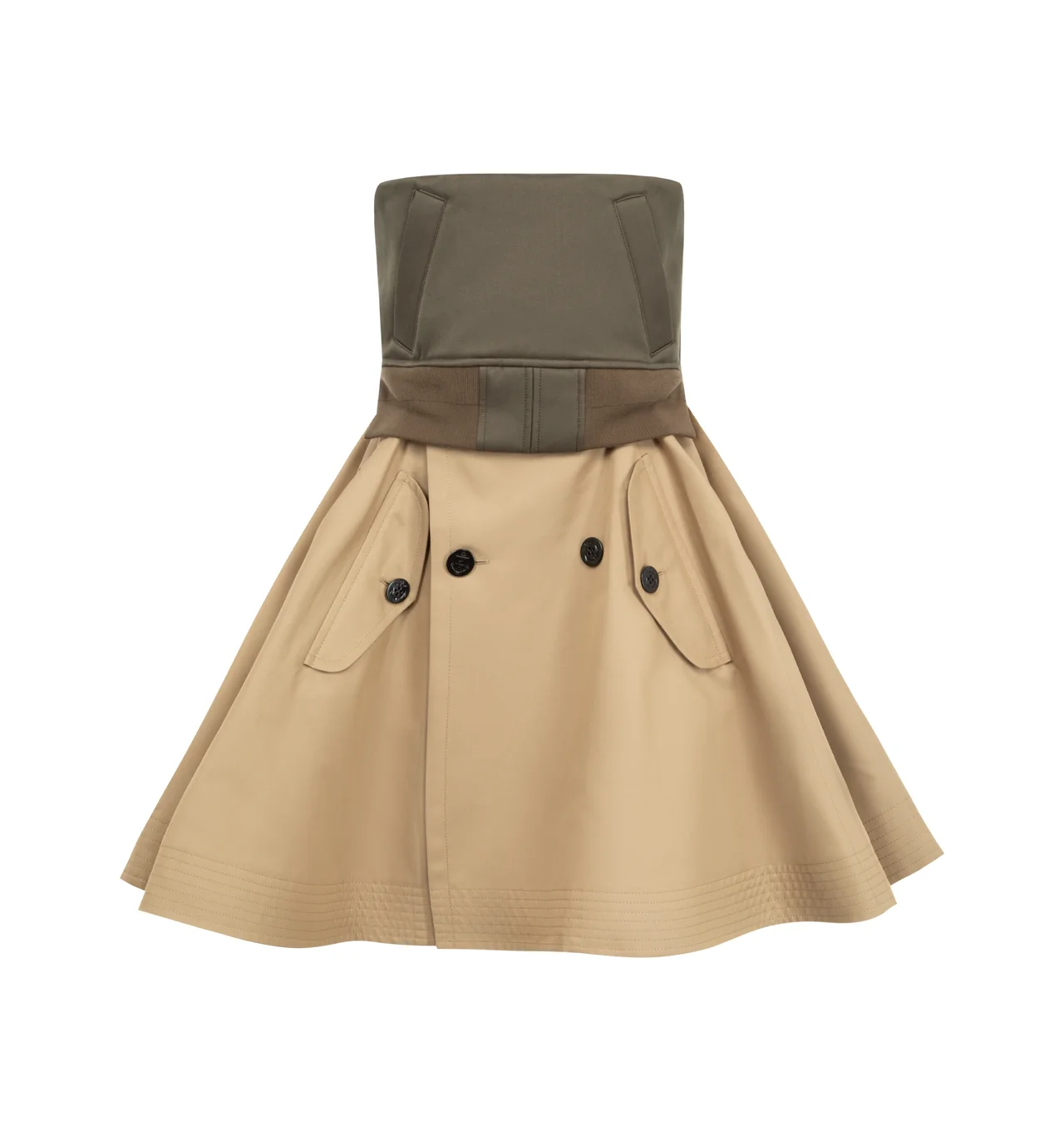 SACAI Cotton Gabardine Dress featuring mini length, strapless, button flap pocket, paneled construction, fitted top and full skirt. Made in Japan. DESIGNER STYLE ID: 26-08501 COLOR: 728 DARK KHAKI/BEIGE