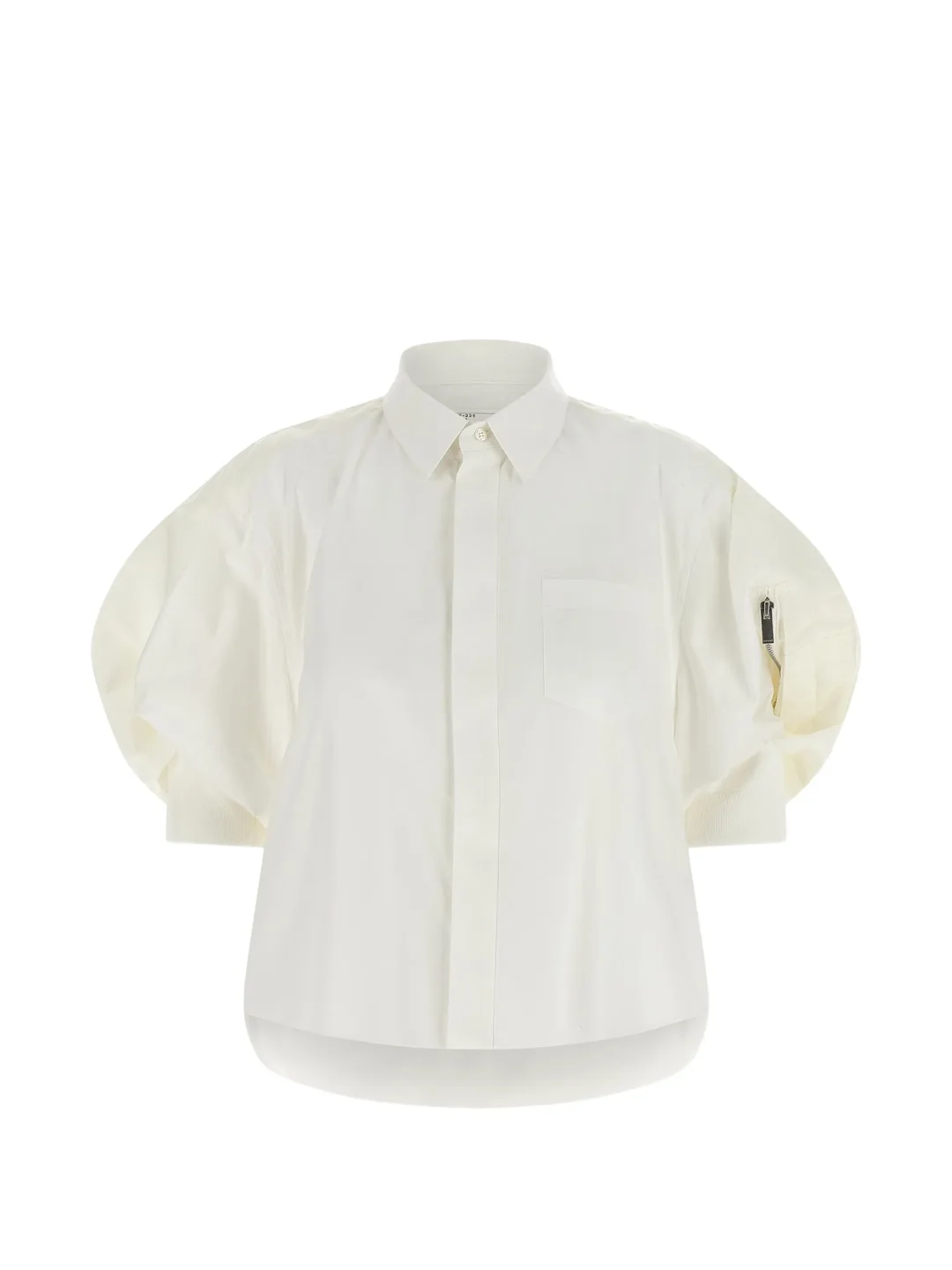 600078107OWT002 / SCW-336/00/151 - Mixed cotton poplin and nylon twill construction - Classic point collar - Long sleeves with button cuffs - Concealed front button closure - Chest utility pocket with zipper - Relaxed fit - Contrast fabric paneling sacai Cotton Poplin x Nylon Twill Shirt delivers innovative fabric mixing with architectural construction. Crafted from premium cotton poplin combined with technical nylon twill panels in crisp white, featuring the brand's signature hybrid approach to materials. The structured silhouette and contrasting fabric zones create sacai's distinctive deconstructed aesthetic.