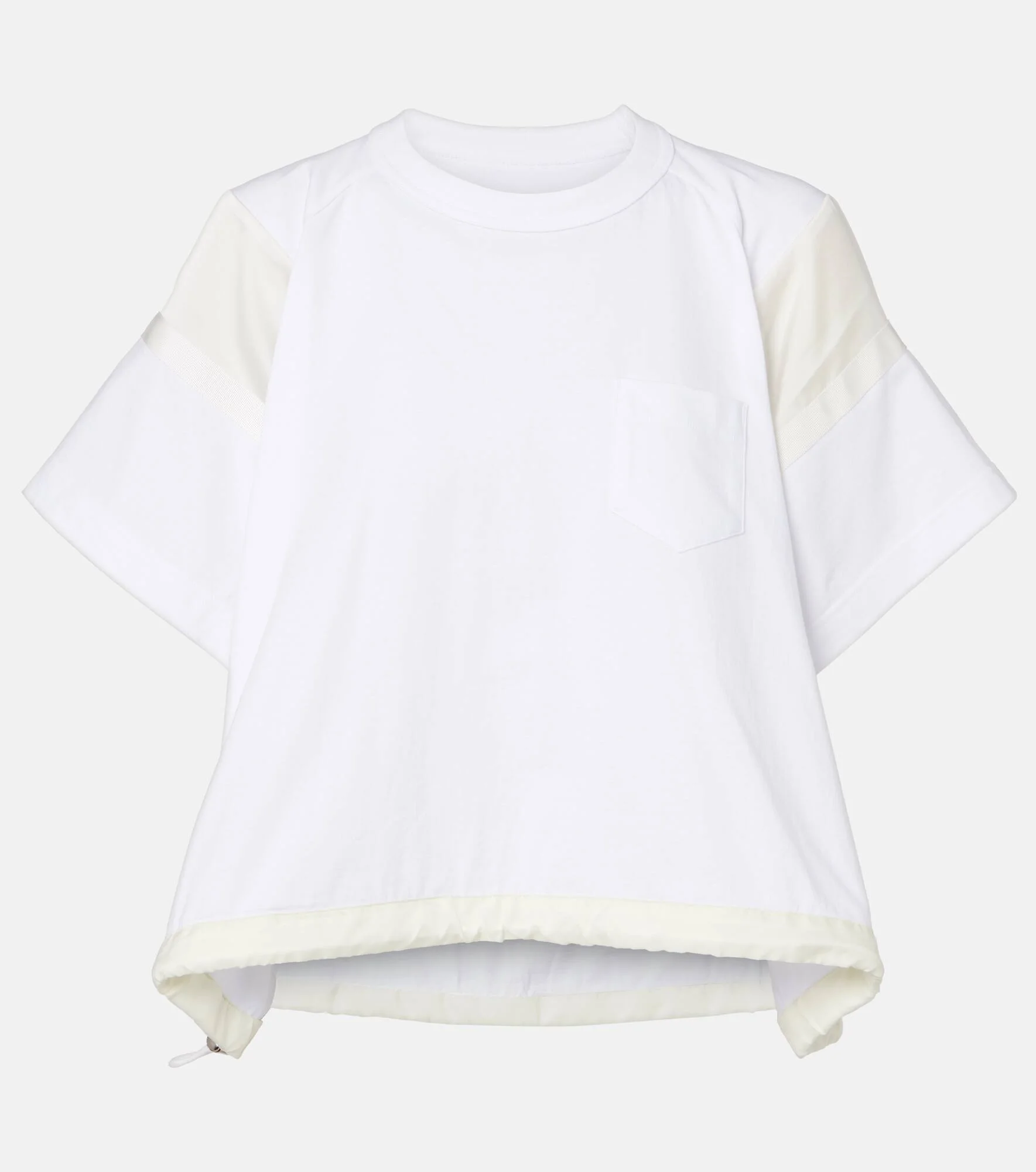 Sacai’s penchant for hybrid designs sees contrasting textures, fabrics, and techniques combined to create entirely unique and innovative styles. This T-shirt is crafted from pure cotton and boasts an angled chest pocket and drawstring at the hem for an adjustable fit. Product Details - Material: 100% cotton - Care instructions: dry clean - Made in Japan - Color: white - Designer color name: White x Off White - Item color: white - Trim: 100% polyester - Pockets: angled chest pocket - Drawstring at the hem for adjustable fit - Item number: P01149518 Size & Fit - True to size - Dropped shoulders - Designed for a loose fit - Adjustable hem - Slightly stretchy fabric - Slightly cropped - The model seen in the picture is 178cm-5'10" and wearing a size 1