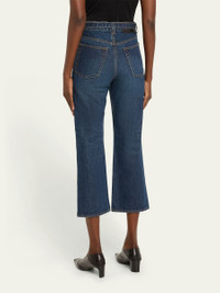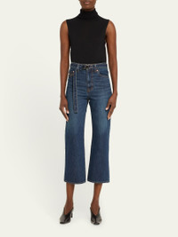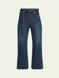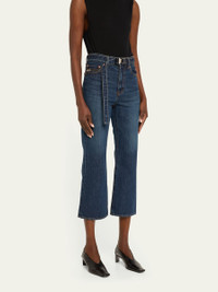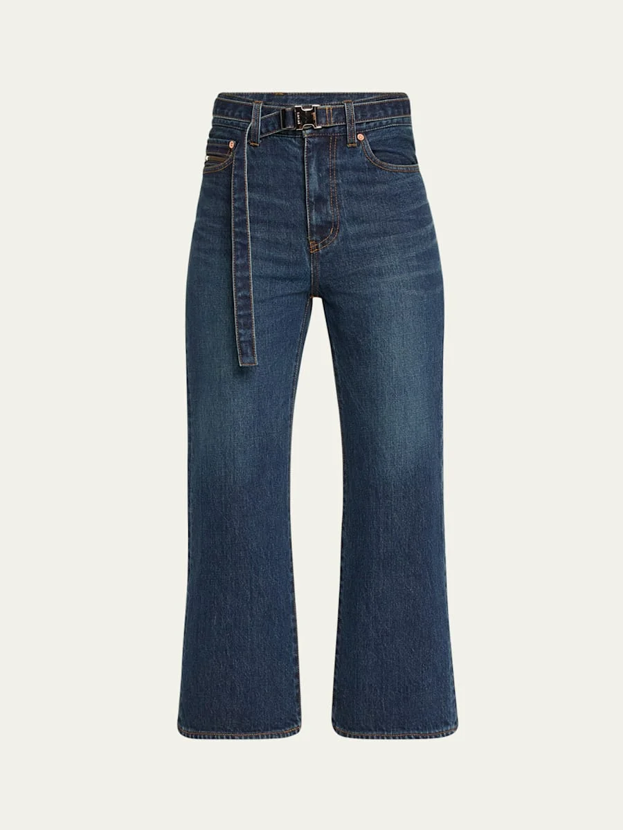 SACAI denim pants with contrast topstitching and a side-release buckle Cropped length High rise Boot-cut legs Five-pocket style Button/zip fly; belt loops Cotton/leather Made in Japan Model is 5'10"/177cm. Online Inquiries: BGS21_B9DB5| Store Inquiries: #4846468