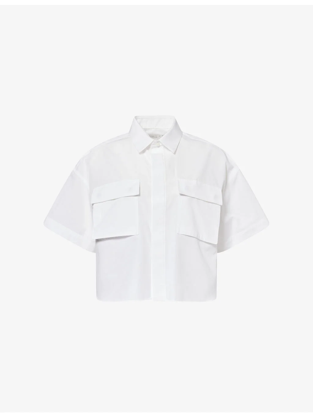 PRODUCT DETAILS - Sacai woven shirt - 65% polyester, 35% cotton; contrast 100% polyester - Concealed button fastenings at front - Spread collar - Closed cuffs - Relaxed fit, cropped, collar, short sleeves, two buttoned pockets at front, straight yoke and pleated at back - Dry clean - Made in Japan - True to size - Size small: length 20in / 52cm - Model is 5ft 10in/1.78m and wears a size small - Lightweight, stretchy Ref: R04568034